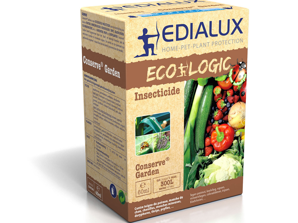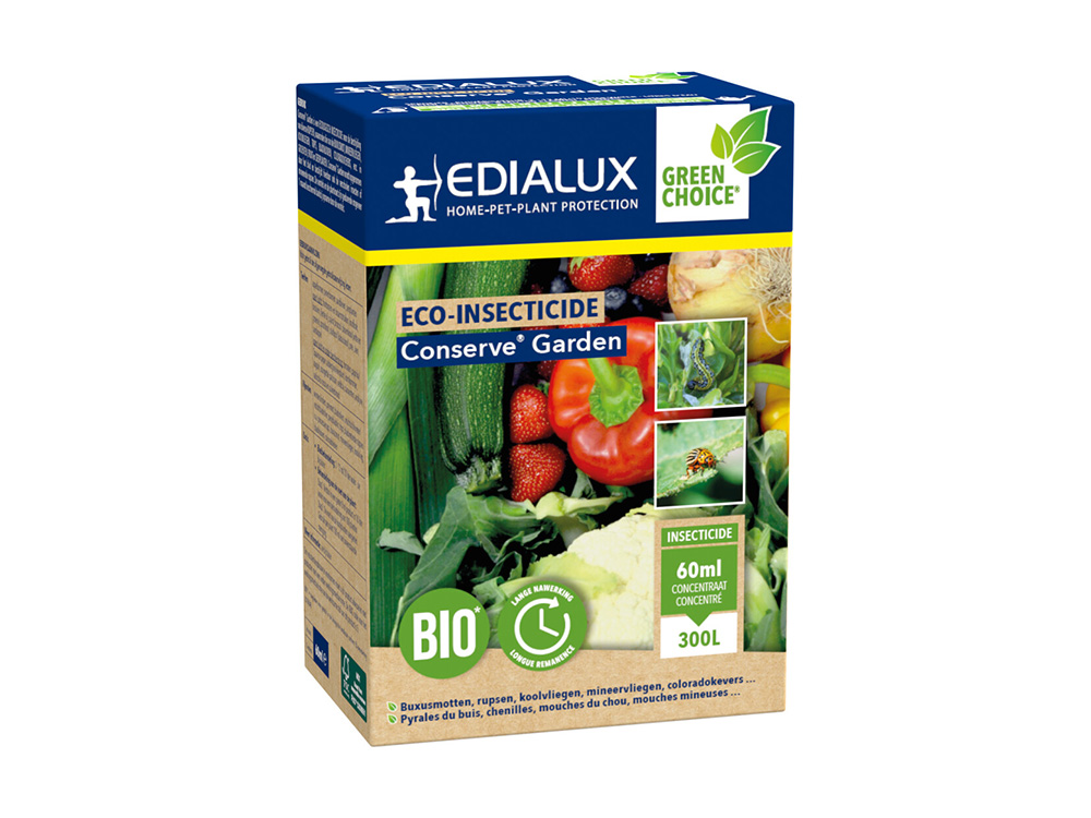 Bestrijd ongedierte in de moestuin en siertuin ecologisch met Conserve Garden. Het maag- en contactinsecticide is van biologische oorsprong en wordt gebruikt voor de bestrijding van diverse rupsen, mineervliegen, coloradokevers, koolvliegen, trips, bladvlooien,... op groenten, fruit en sierplanten.