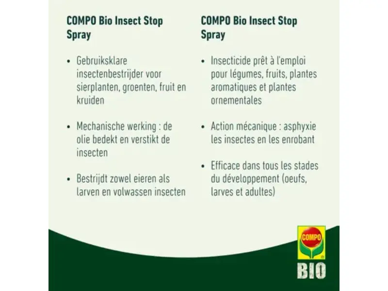 Compo Bio Insect Stop Spray gebruikt koolzaadolie als natuurlijk werkend bestanddeel. De spray legt een laagje over de insecten, waardoor ze worden afgesloten en verstikken. Zo bestrijdt het product effectief eitjes, larven en volwassen stadia, zonder dat er resistentie ontstaat. Door de brede werking is het geschikt voor sierplanten, kruiden, groenten, fruitbomen en kleinfruit.