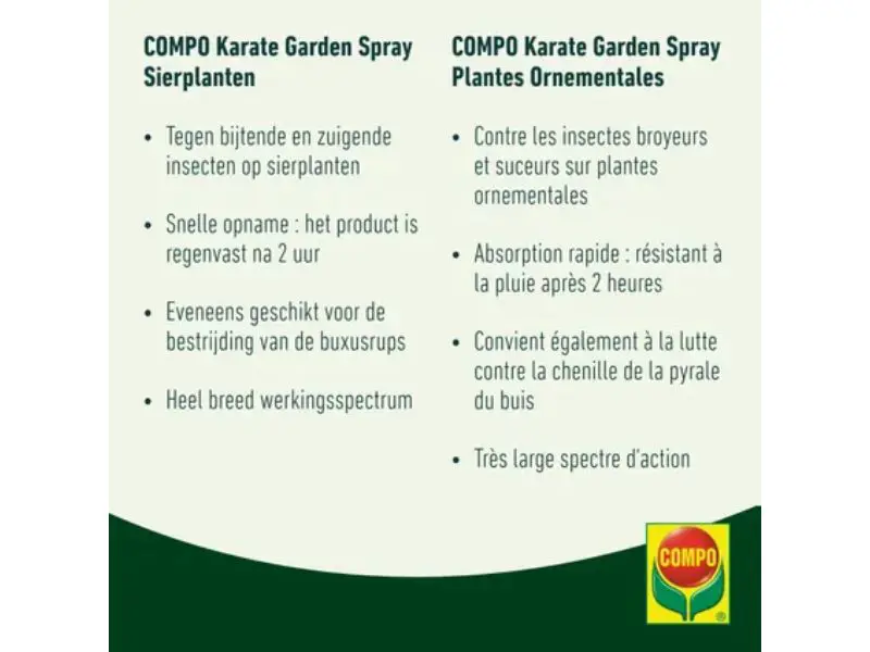 Compo Karate Garden is direct klaar voor gebruik en werkt snel tegen allerlei ongewenste insecten op sierplanten. De geavanceerde formulering zorgt ervoor dat het middel al binnen 2 uur regenvast is. Hierdoor hoef je je geen zorgen te maken over een regenbui na het toepassen. De spray werkt langdurig door en beschermt jouw planten tot 2 weken na behandeling.