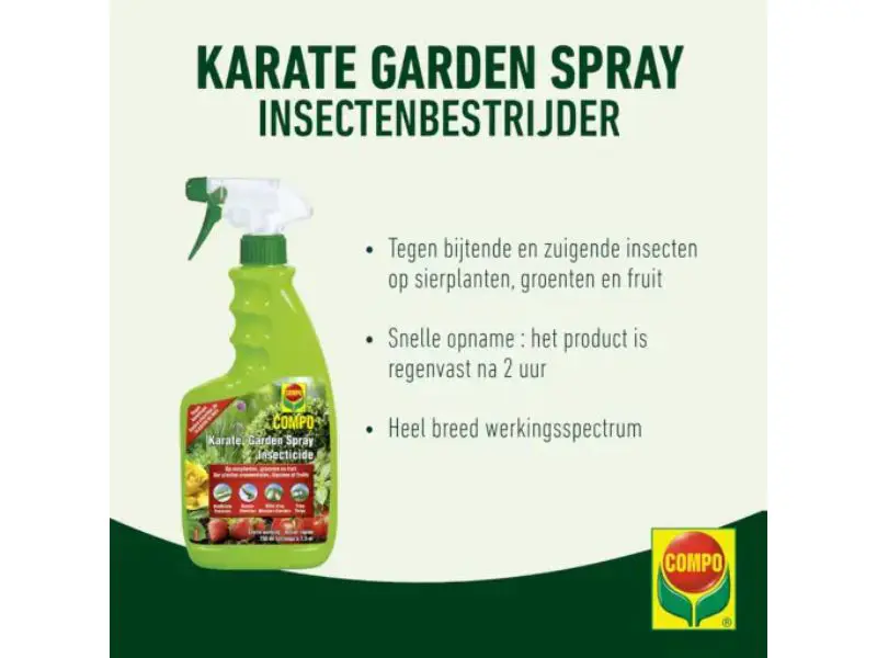 fruit. Met Compo Karate Garden Spray worden allerlei bijtende en zuigende insecten bestreden zoals buxusrups, bladluizen, kevers, wantsen, rupsen, trips, witte vlieg, ...