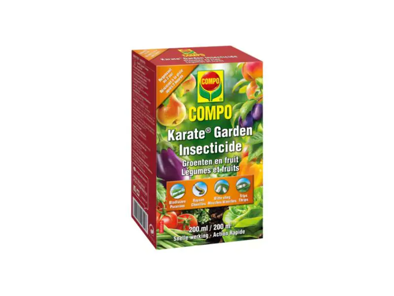 Compo Karate Garden is een systemisch insecticide met het breedste werkingsspectrum op de markt. Met meer dan 200 toepassingen kunt u alle zuigende en bijtende insecten op planten, groenten en fruit bestrijden. Dankzij de specifieke samenstelling wordt het product snel door de plant opgenomen. Daardoor heeft regen na 2 uur geen invloed op de behandeling. De werking houdt 2 weken na de behandeling aan.