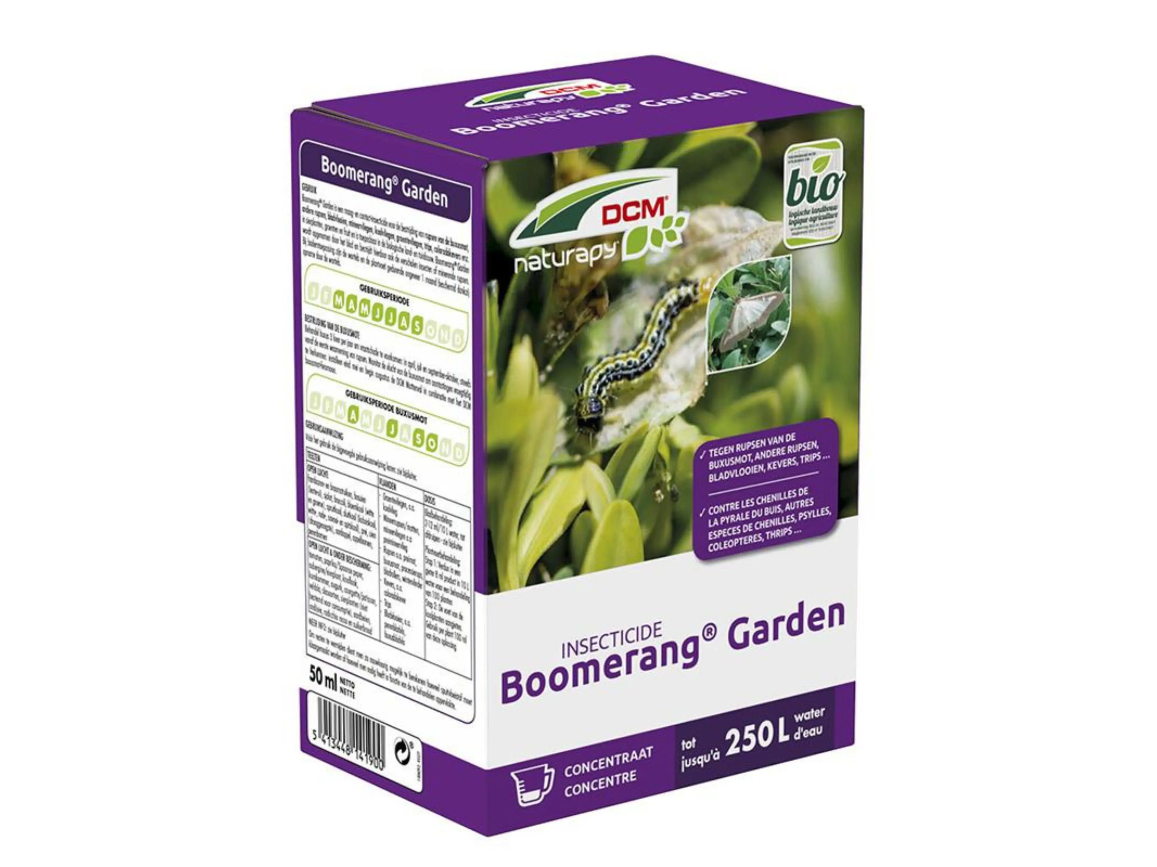 Boomerang Garden van DCM is ideaal voor het bestrijden van rupsen van de buxusmot, andere rupsen, bladvlooien, mineervliegen, koolvliegen, groentevliegen, (colorado)kevers, trips,… in sierplanten.