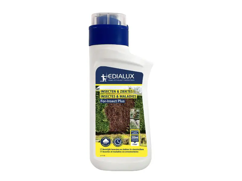Bestrijdt de meeste insecten (bladluizen, mijten, dop-, schild- en wolluizen, witte vliegen, trips, rupsen zoals die van de buxusmot, bladmineerders, kevers) op sierplanten en beschermt ook tegen ziekten (echte meeldauw/witziekte & roest). Ideaal voor de bescherming van buxus en coniferen. For-Insect Plus heeft een systemische werking waardoor het tot in de sapstroom van de plant wordt opgenomen. Regen en besproeiingswater hebben zo weinig invloed en het product biedt het 3 tot 4 weken werking. Insecten die van de plant eten sterven (maaggif). Het resultaat is niet onmiddellijk zichtbaar, maar de planten blijven wel veel langer insectenvrij.