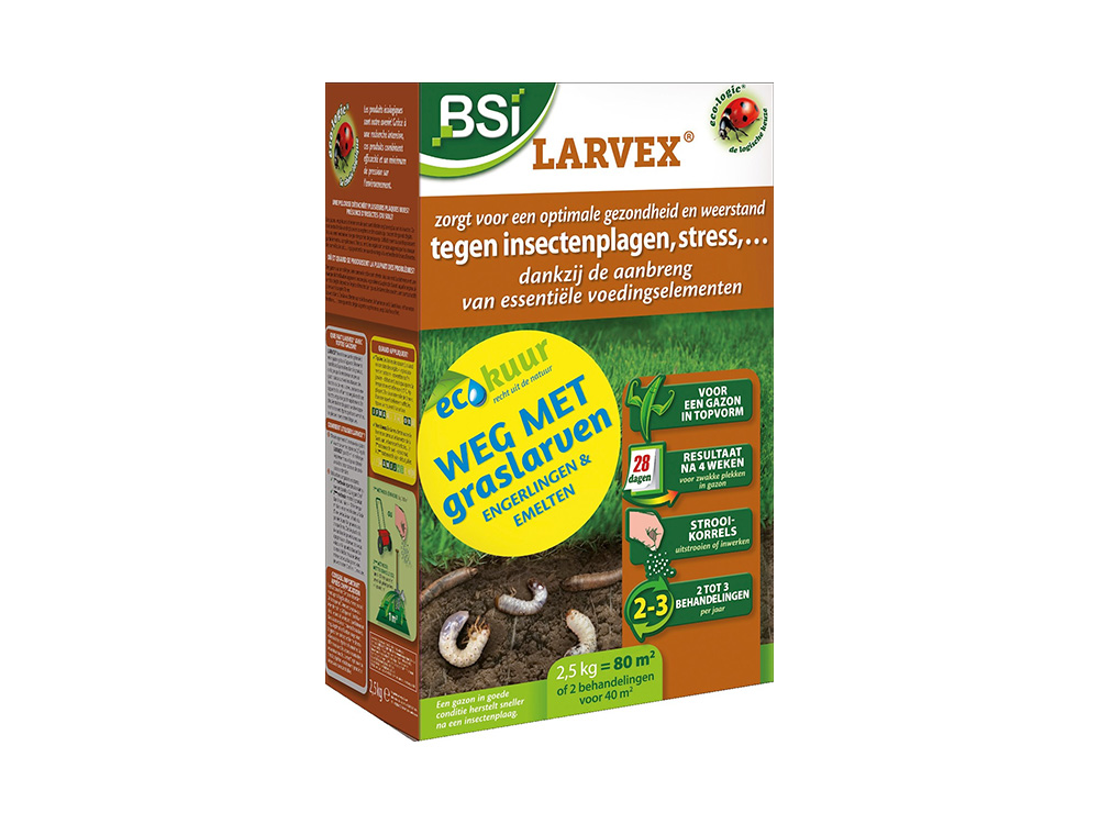 Larvex van BSI voor een optimale gezondheid en weerstand van jouw gazon. Verdrijft allerlei graslarven zoals engerlingen, emelten en andere bodeminsecten op een ecologische maar zeer krachtige wijze.