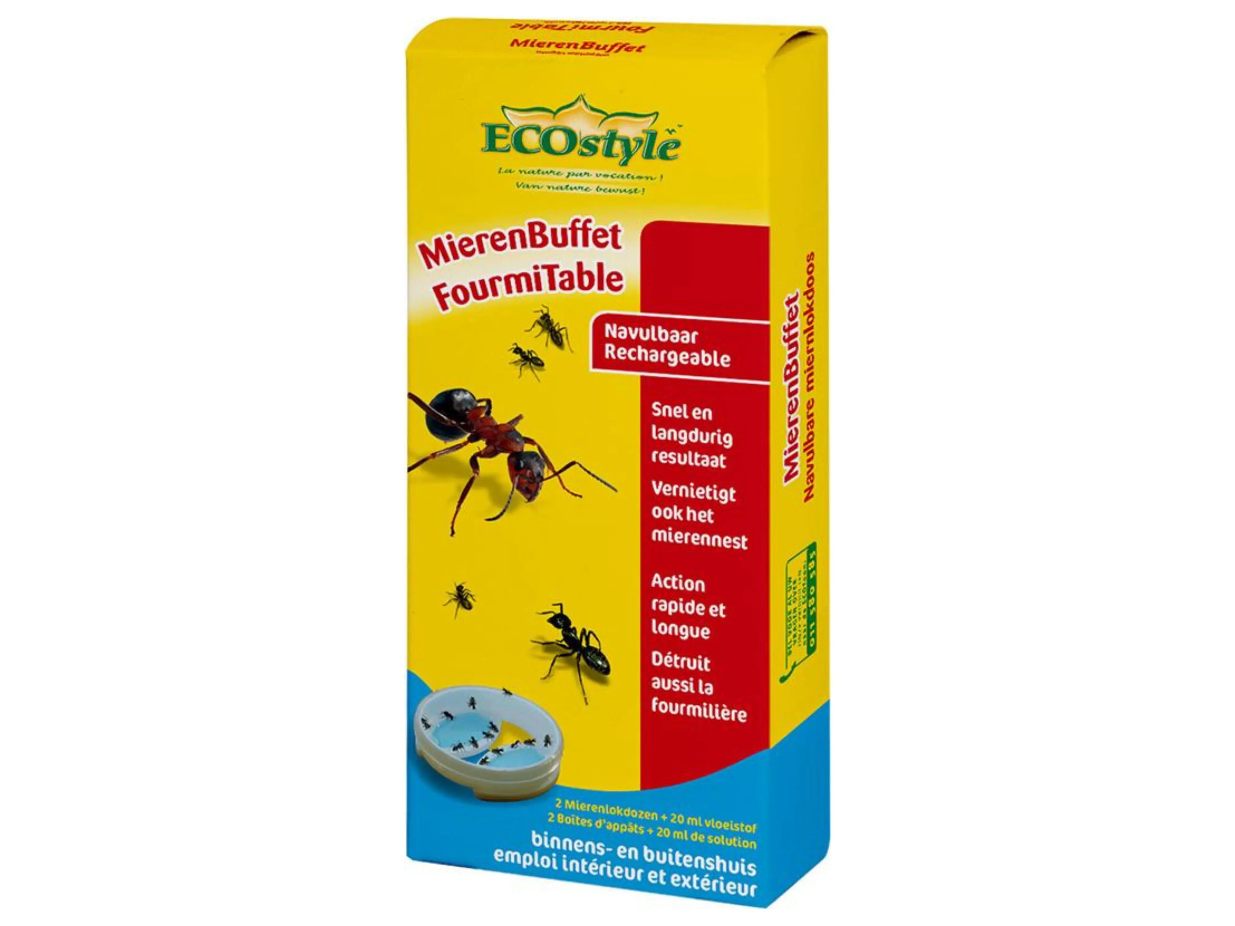 Het mierenbuffet bestaat uit twee navulbare mierenlokdoosjes voor bestrijding van mieren in huis, op terras en balkon.