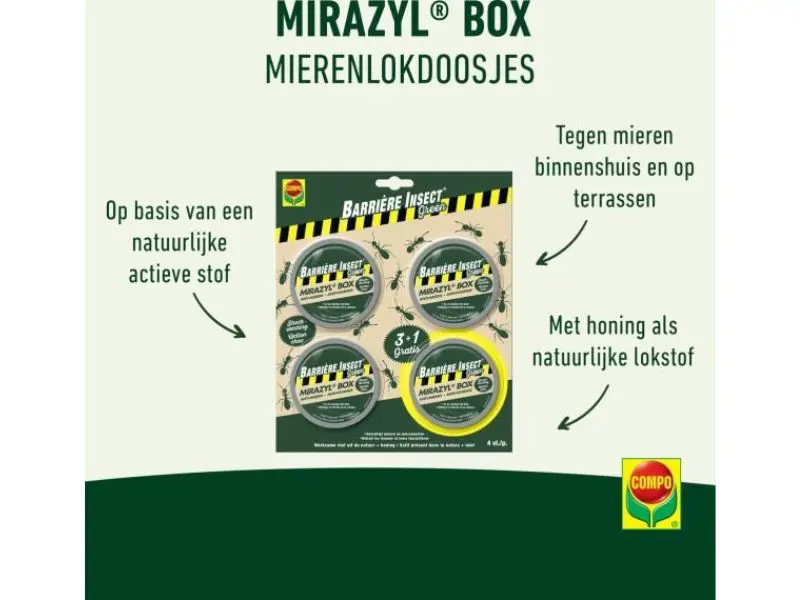 Mirazyl Box is een natuurlijk lokmiddel voor een snelle en betrouwbare bestrijding van mieren en mierennesten. Het discrete en handige lokdoosje kan zowel binnenshuis als op terrassen geplaatst worden. Het trekt de mieren aan met honing, een uitstekende en natuurlijke lokstof. De werkzame stof Spinosad, gewonnen uit een natuurlijke bodembacterie, wordt door de mieren meegenomen naar het nest waardoor het volledig wordt vernietigd. Dankzij het speciale lokdoosje is het product