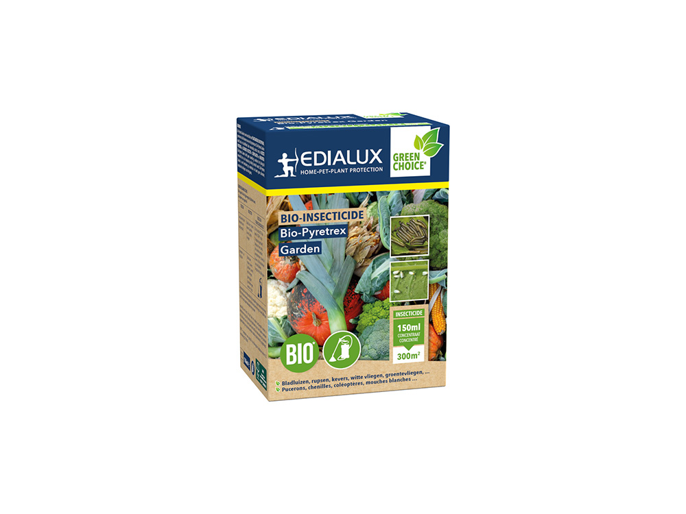 Bio-Pyretrex tegen oa buxusmotrupsen voor sierplanten en groenten. Insecticide van plantaardige oorsprong (gewonnen uit bloemen) voor de bestrijding van ongedierte in de tuin. Een breedwerkend contactmiddel dat geen schadelijk residu nalaat. Doodt snel en doeltreffend door eenvoudig contact de meeste vretende en zuigende insecten in de siertuin en groententuin. Een formulering op waterbasis, m.a.w. zonder solventen!