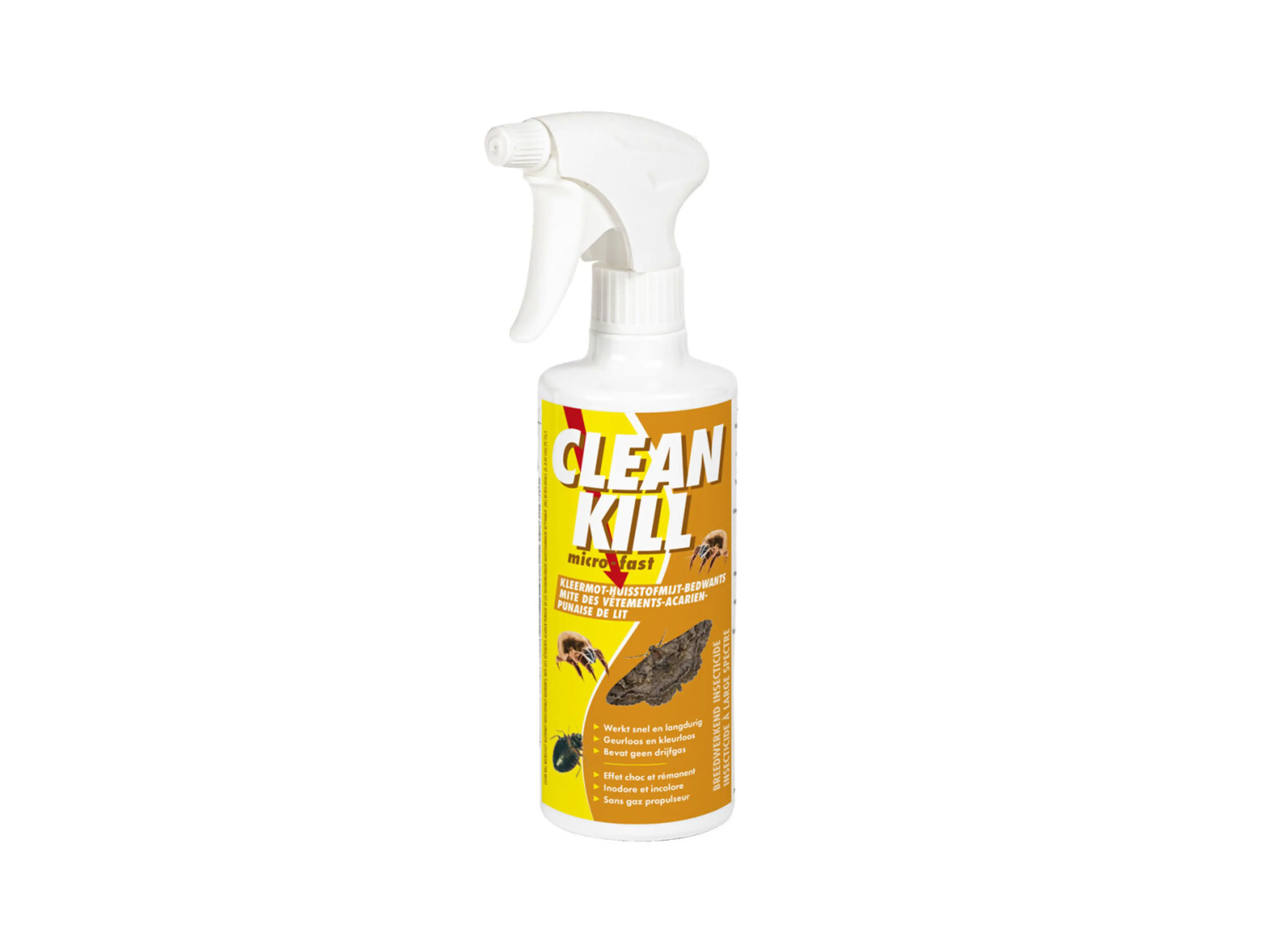 Clean Kill van BSI werkt effectief bij de bestrijding van kleermotten, huisstofmijten en bedwantsen. Het middel is geurloos, vlekt niet, bestrijdt snel en krachtig en biedt bovendien een lange nawerking! Het product werkt ook voor het bestrijden van heel wat andere vliegende en kruipende insecten in de woning, maar ook tegen vlooien, teken, luizen en andere insecten in de omgeving van huisdieren.