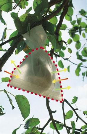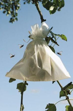 De fruitzakjes zijn water- en luchtdoorlatend en verzekeren zo de ontwikkeling van gave vruchten. Het plaatsen van de hoezen gebeurt na het vormen van de vruchten in de loop van de zomer.