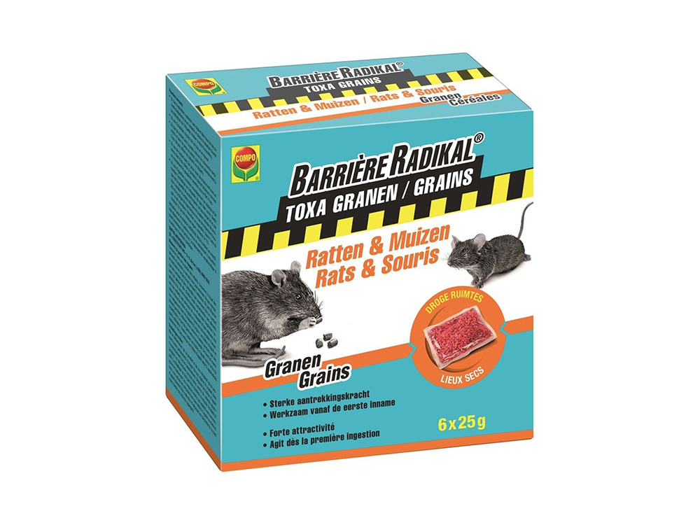 Compo Barriere radical muizengif is de radicale oplossing tegen ratten en muizen en werkzaam vanaf de eerste inname. Een muizengif met een sterke aantrekkingskracht voor ongedierte op basis van graantjes.
