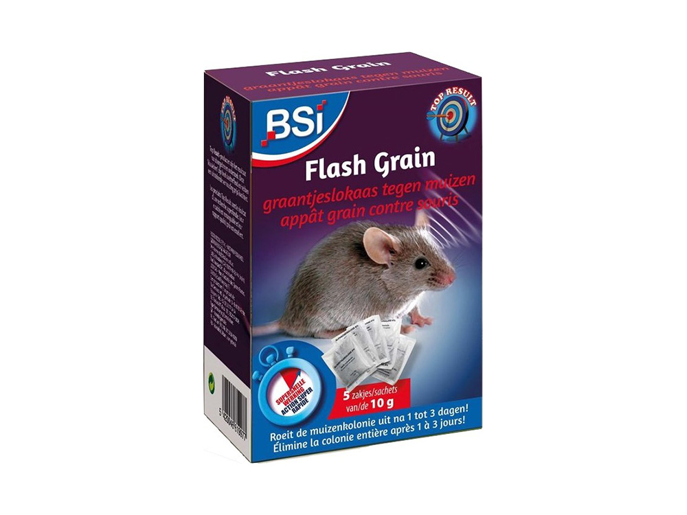 Flash grain bevat zakjes van 10 gram graantjeslokaas met een supersnelle werking waardoor dit muizengif een muizenkolonie kan uitroeien op 1 à 3 dagen.