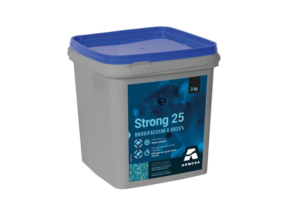 Strong 25 is het krachtigste lokaas op de markt verwerkt tot een aantrekkelijk graanlokaas. Eén enkel opname van het gif brodifacoum gif volstaat om het dier te doden. Kan toegepast worden in de tuin, op zolder, in de kelder, schuur,...