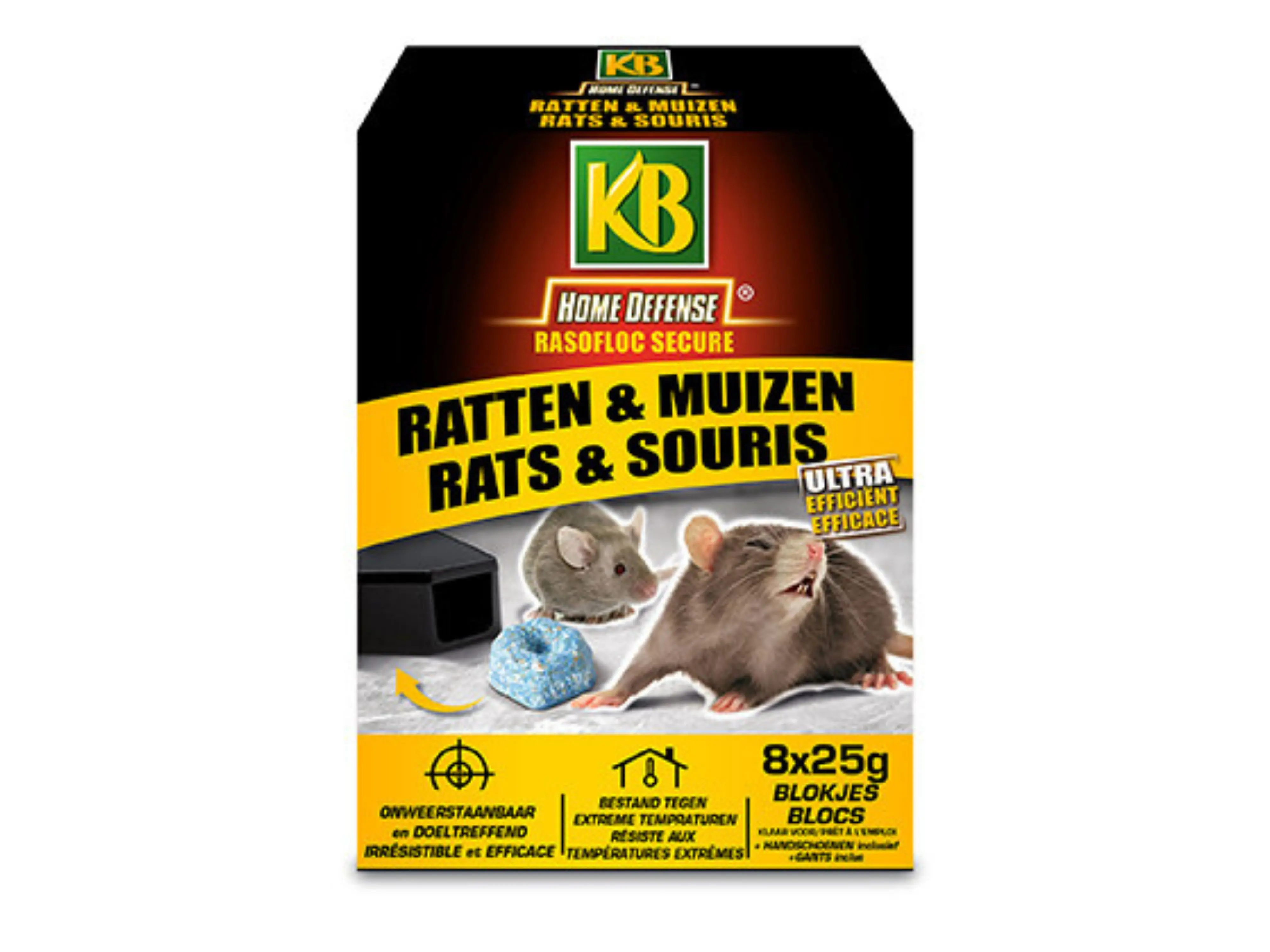 Bestrijd ratten en muizen in en om het huis doeltreffend met Rasofloc secure bloc van KB. Dankzij het assortiment van Home Defence kun je zelf ongedierte bestrijden. Het is een makkelijke en gebruiksklare oplossing om een ratten- of muizenplaag tegen te gaan. Ook bij extreme temperaturen, zoals vrieskou of een hittegolf blijft het gif zijn uitzonderlijke werking behouden en dit zowel in droge als in vochtige ruimten.