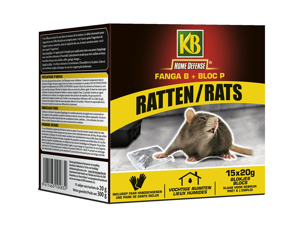 Rattengifblokjes Fanga B + Bloc P zijn een efficiënte manier om ratten in en om het huis te bestrijden. De blokjes zijn heel makkelijk in gebruik dankzij de voorgedoseerde verpakking. Ze werden ontwikkeld om ook in vochtige ruimtes zoals kelder, schuur of garage,... te kunnen gebruiken. Ze zijn bestand tegen vocht, schimmel en regen waarbij de werking even doeltreffend blijft.