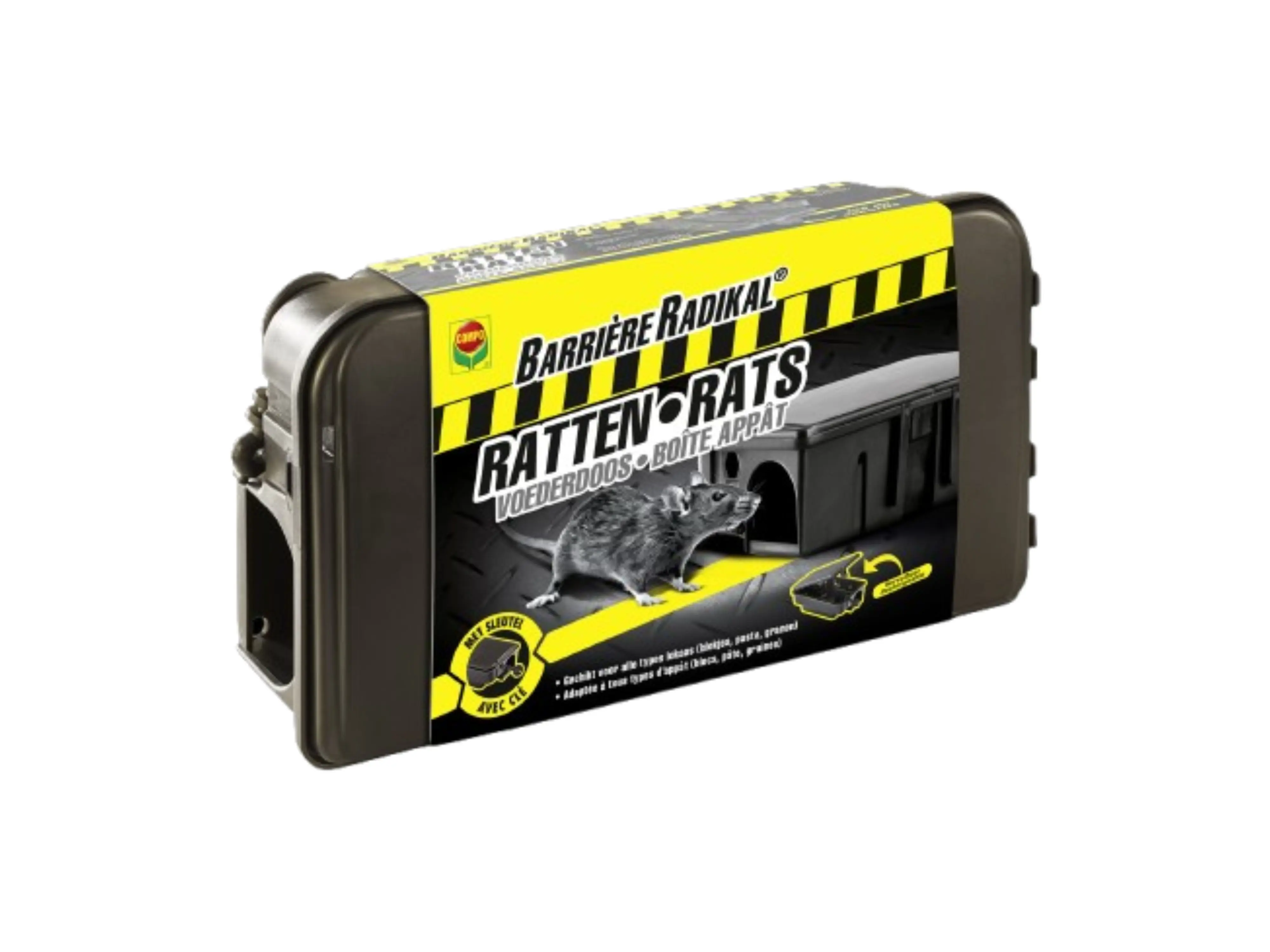 COMPO Barrière Radikal Voederdoos Ratten is een eenvoudig te gebruiken voederdoos voor de plaatsing van alle soorten toegelaten lokaas zoals graantjes, blokjes en pasta, vooral in vochtige ruimtes.