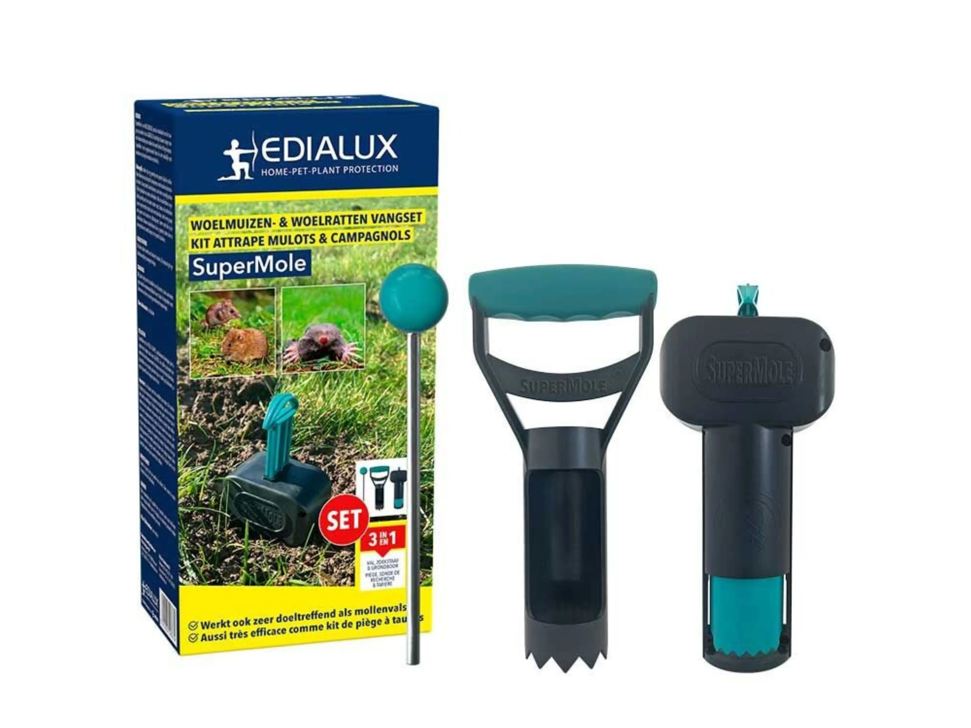 Last van woelmuizen of woelratten? Met de Edialux SuperMole is dat snel verleden tijd! Deze handige 3-in-1 kit bevat alles wat je nodig hebt: een krachtige Supermole-val, een opsporingsstaaf om eenvoudig de gangen van de muizen op te sporen, en een grondboor om snel en precies een gat te maken om de val te plaatsen.