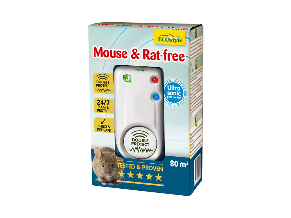 De Mouse and rat free van Ecostyle is een krachtige ultrasone verjager geschikt voor het bestrijden van ongedierte binnen één ruimte! De Double Protect functie combineert Single Protect en Electro Pulse. Het biedt een dubbele bescherming tegen muizen en ratten.
