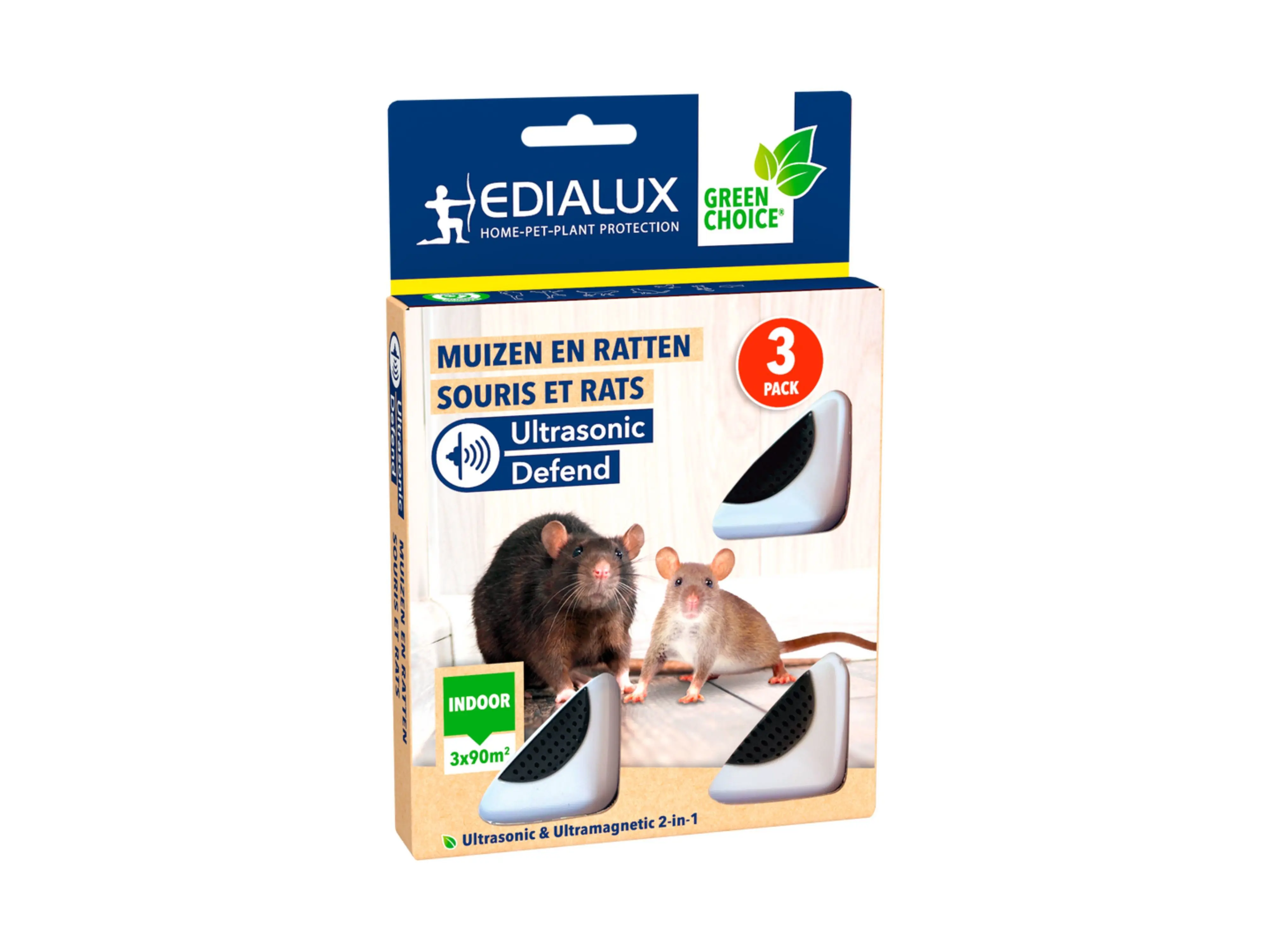 Set van drie ultrasone toestellen voor gebruik binnenshuis ter bestrijding van muizen en ratten. Deze apparaten zenden hoogfrequente geluidsgolven uit die niet waarneembaar zijn voor mensen en huisdieren zoals honden, katten, vogels, vissen en reptielen.