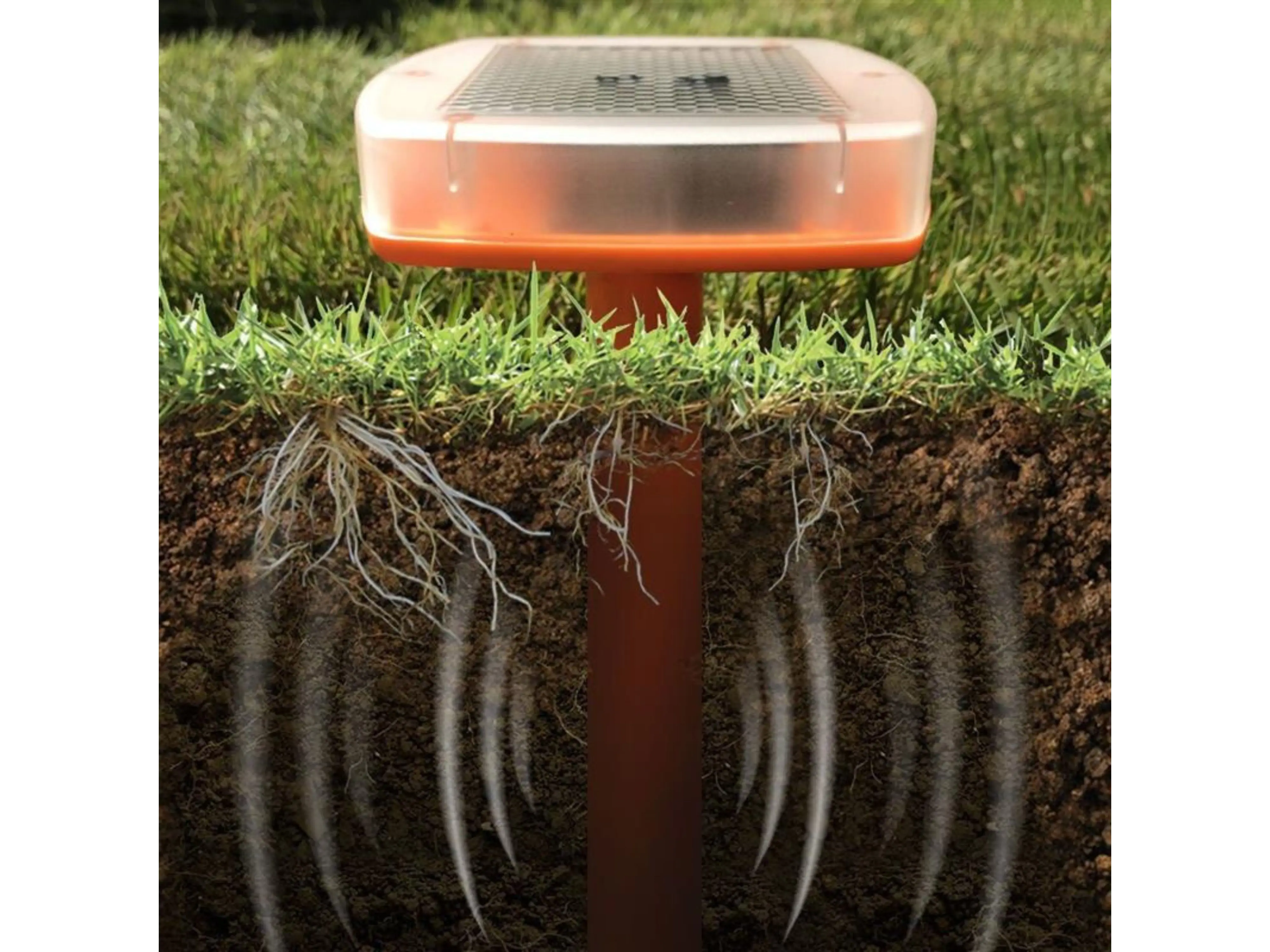 De solar Mega-Sonic mollenverjager is aan de bovenzijde voorzien van een groot zonnepaneel. De ingebouwde oplaadbare batterijen laden hierdoor op in de zon. Zo kan de verjager enerzijds krachtige trilling produceren, anderzijds sonische pulsen van een lage frequentie in intervallen van 30 seconden.
