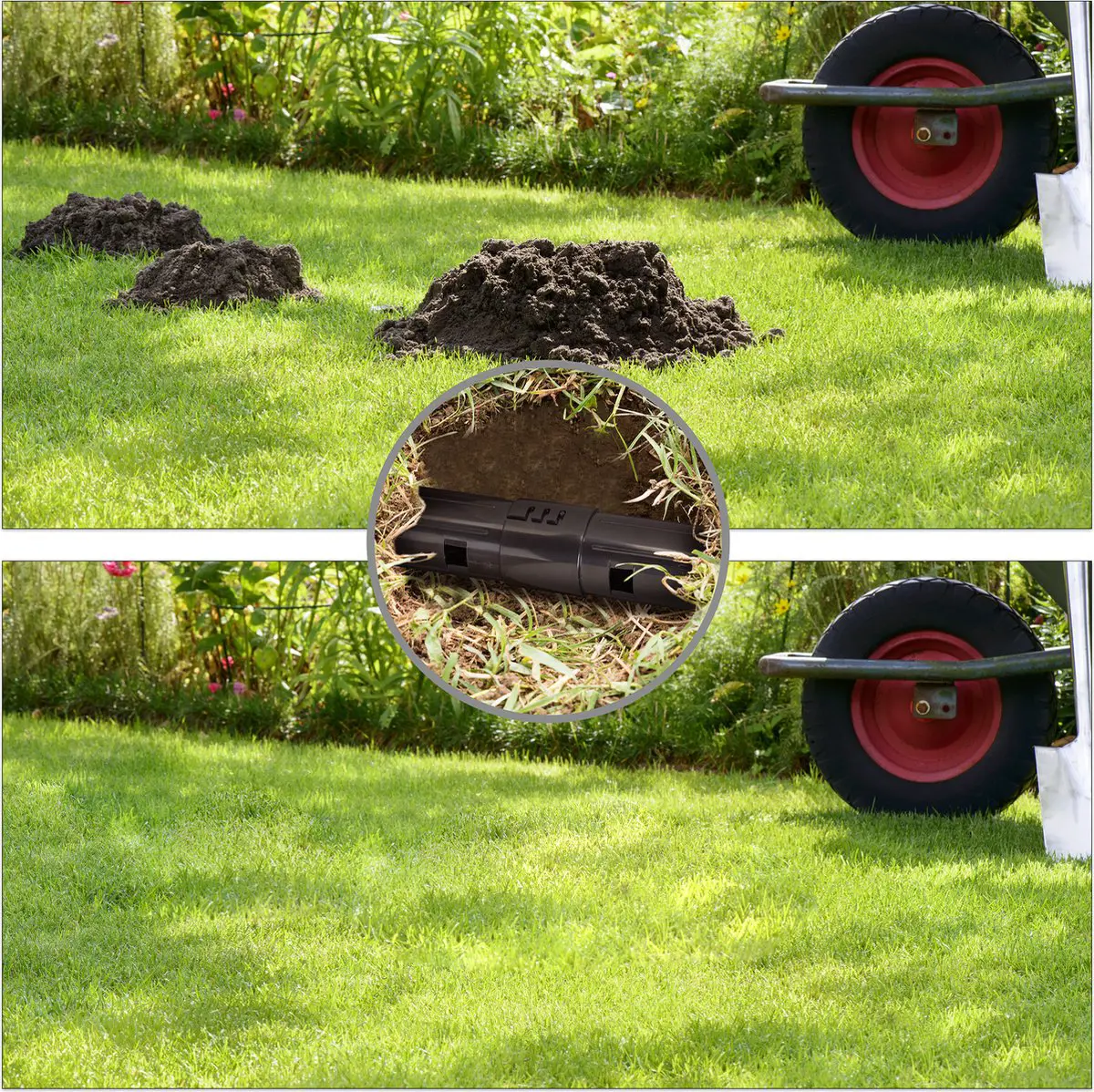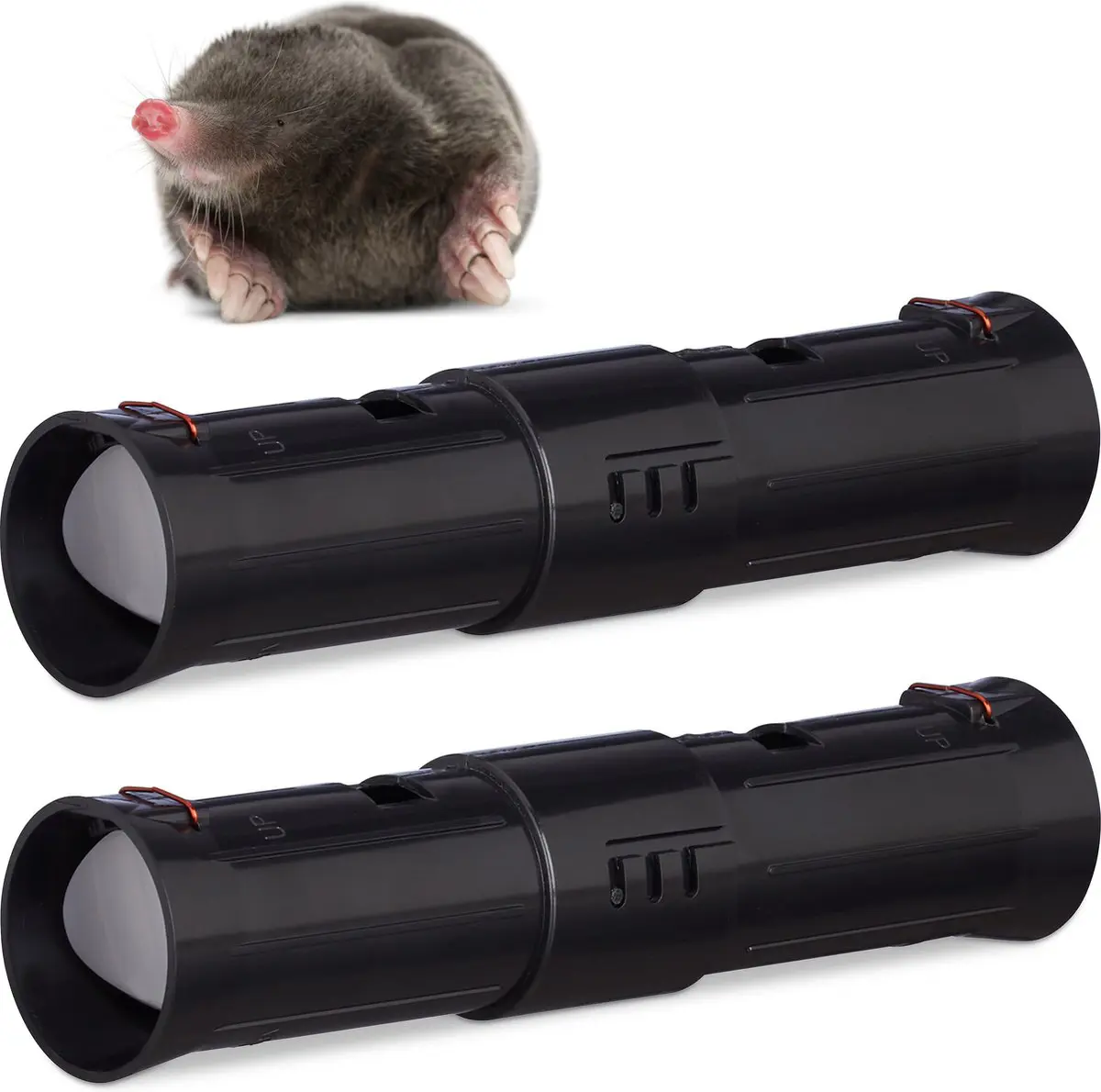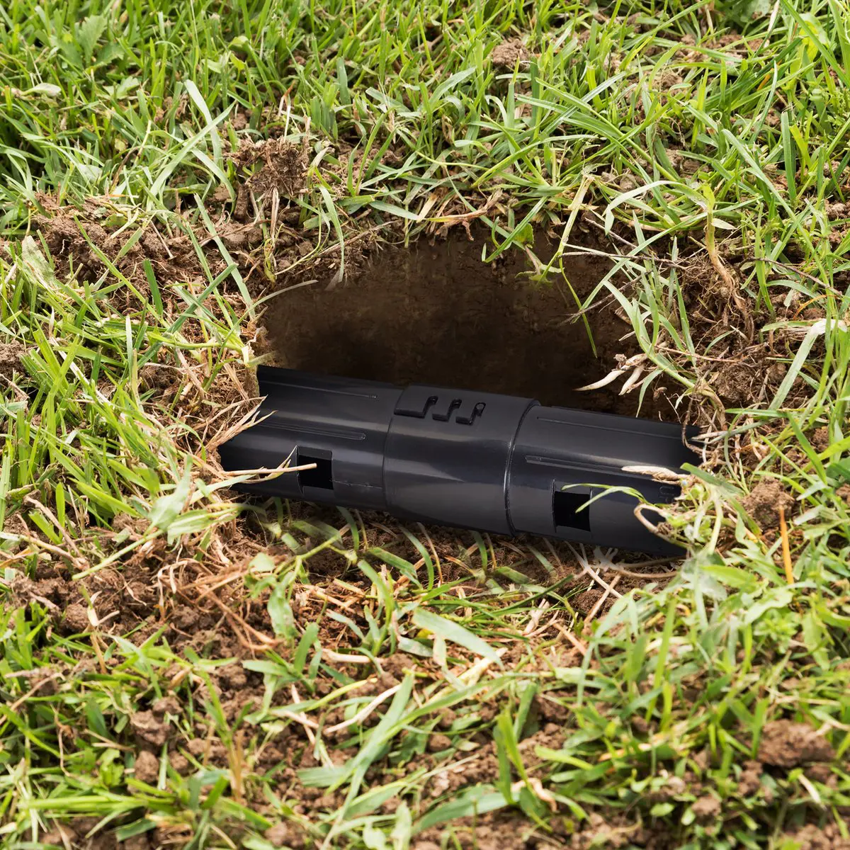 De val is gemakkelijk te plaatsen. Je hoeft alleen een gat te graven in de mollengang en de mollenval er in te plaatsen met de kijkopeningen naar boven. Bedek de mollenval met een tegel of baksteen zodat je via de twee controlegleuven altijd kunt nakijken of er een mol is gevangen.