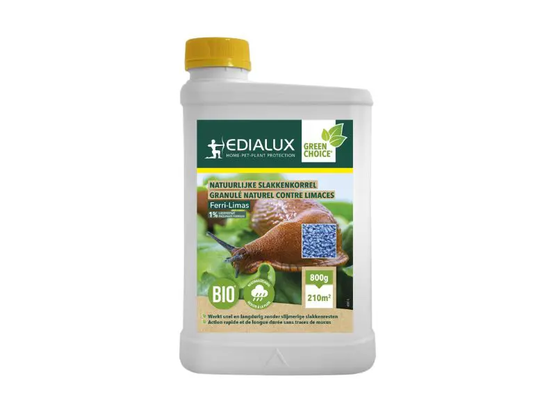 De Edialux Ferri-Limas slakkenkorrels zijn ecologisch en bevatten 1% ijzerfosfaat, een stof die van nature al in de bodem voorkomt. De korrels zwellen op en nemen vocht op uit de grond, waardoor ze extra aantrekkelijk zijn voor naaktslakken. Na consumptie stoppen de slakken met eten en trekken zich terug in hun schuilplaats, waar ze uit het zicht verdwijnen. Je vindt dus geen nare resten in je tuin en het product is veilig voor egels, vogels en andere huisdieren.