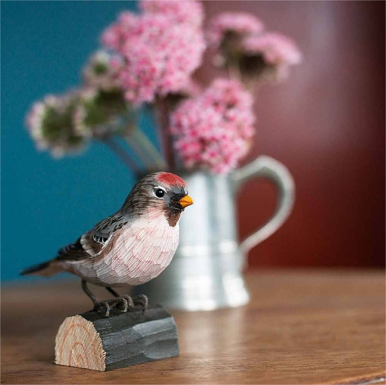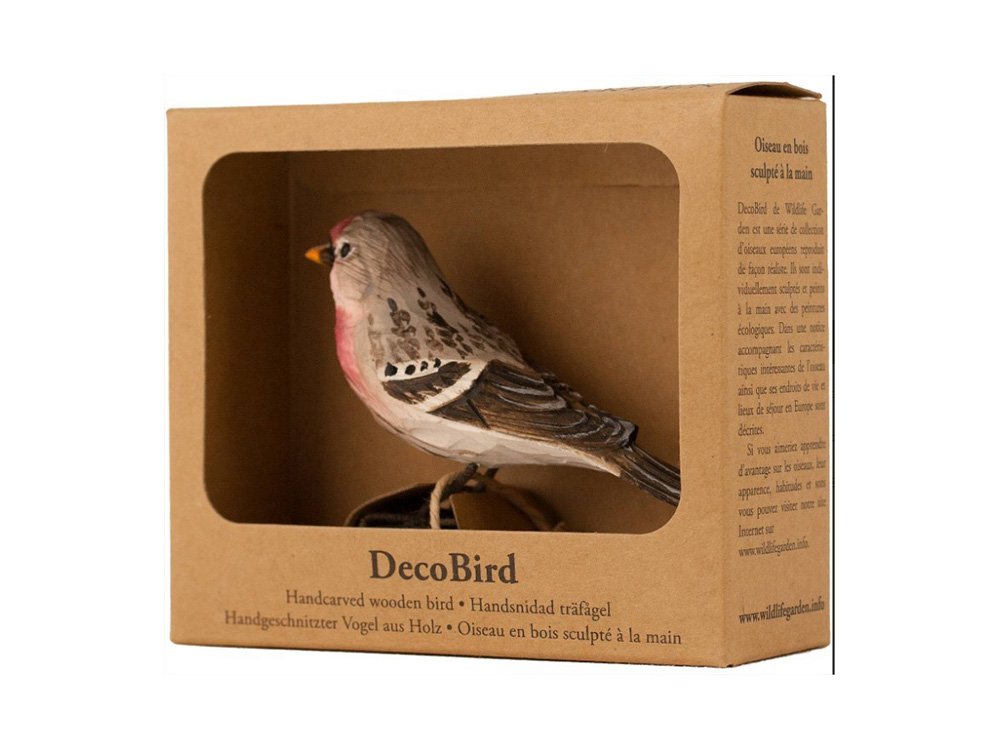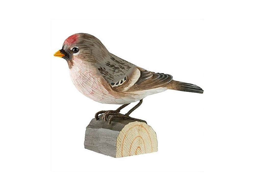 Ambachtelijk vormgegeven houten barmsijs (Carduelis flammea). De barmsijs wordt op ware grootte weergegeven en is beschilderd met milieuvriendelijke verf.