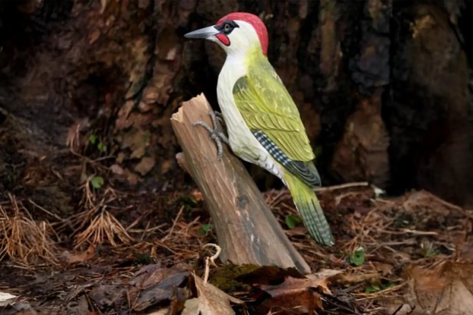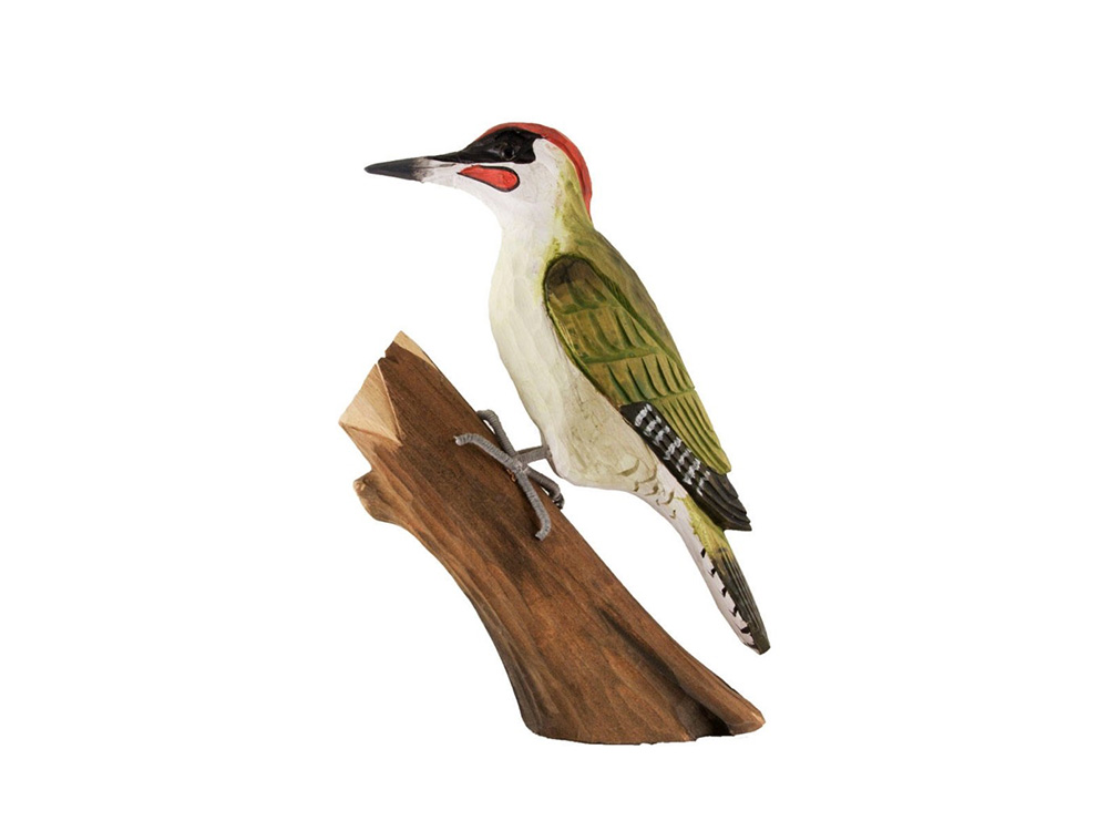 Ambachtelijk vormgegeven houten vogel. Het dierenbeeldje wordt op waar formaat weergegeven en is beschilderd met milieuvriendelijke verf.