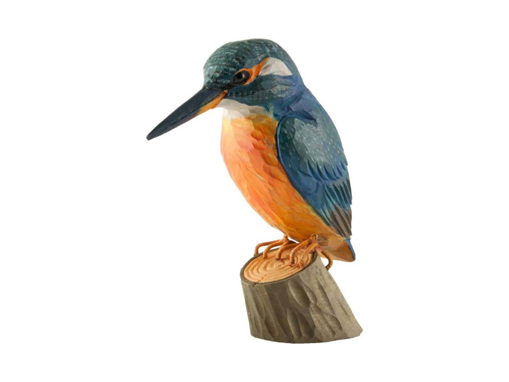 Ambachtelijk vormgegeven houten ijsvogel. De ijsvogel wordt op ware grootte weergegeven en is beschilderd met milieuvriendelijke verf.