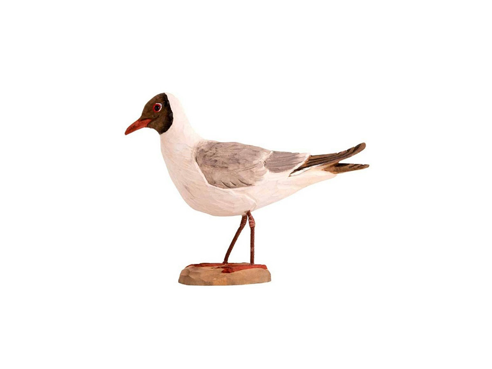 Ambachtelijk vormgegeven houten kokmeeuw. De kokmeeuw wordt op ware grootte weergegeven en is beschilderd met milieuvriendelijke verf.