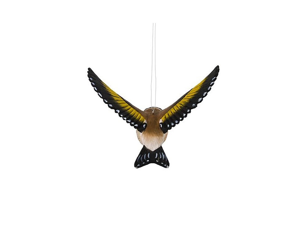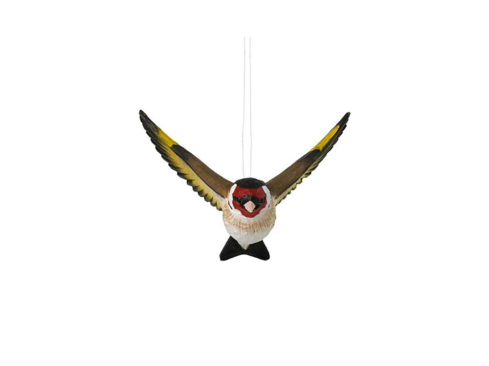 Ambachtelijk vormgegeven houten distelvink of putter. De vliegende distelvink wordt op ware grootte weergegeven en is beschilderd met milieuvriendelijke verf.