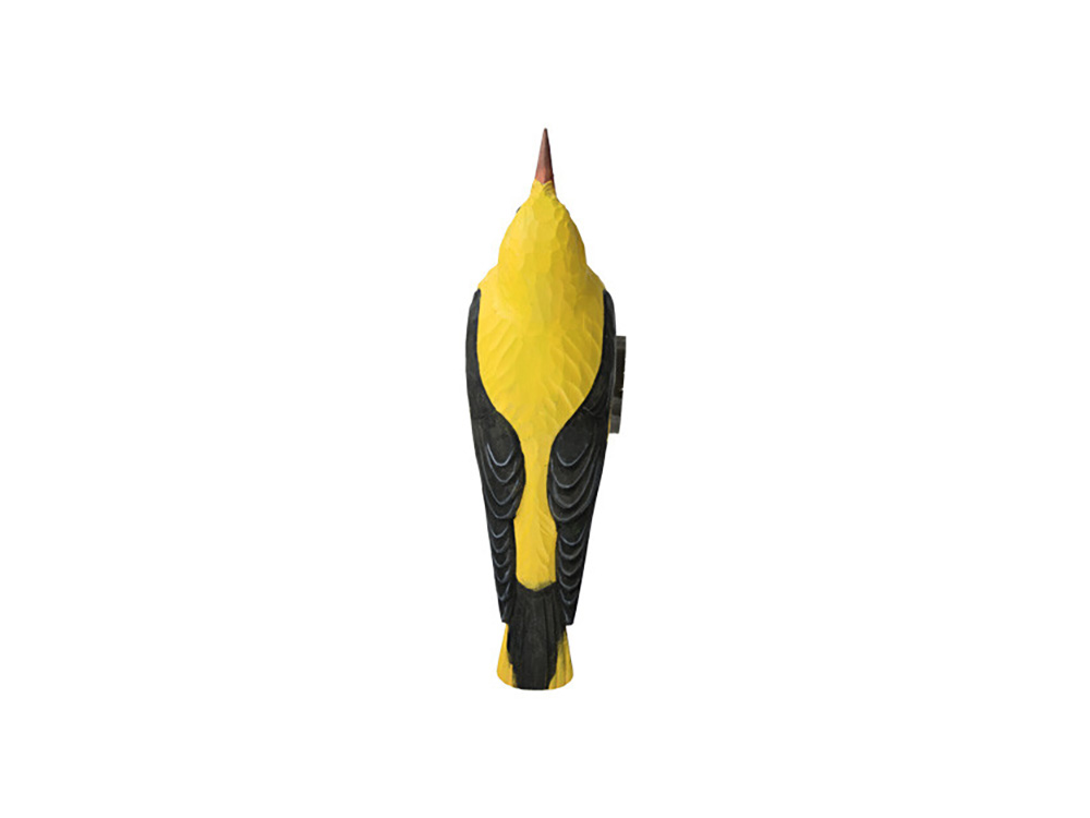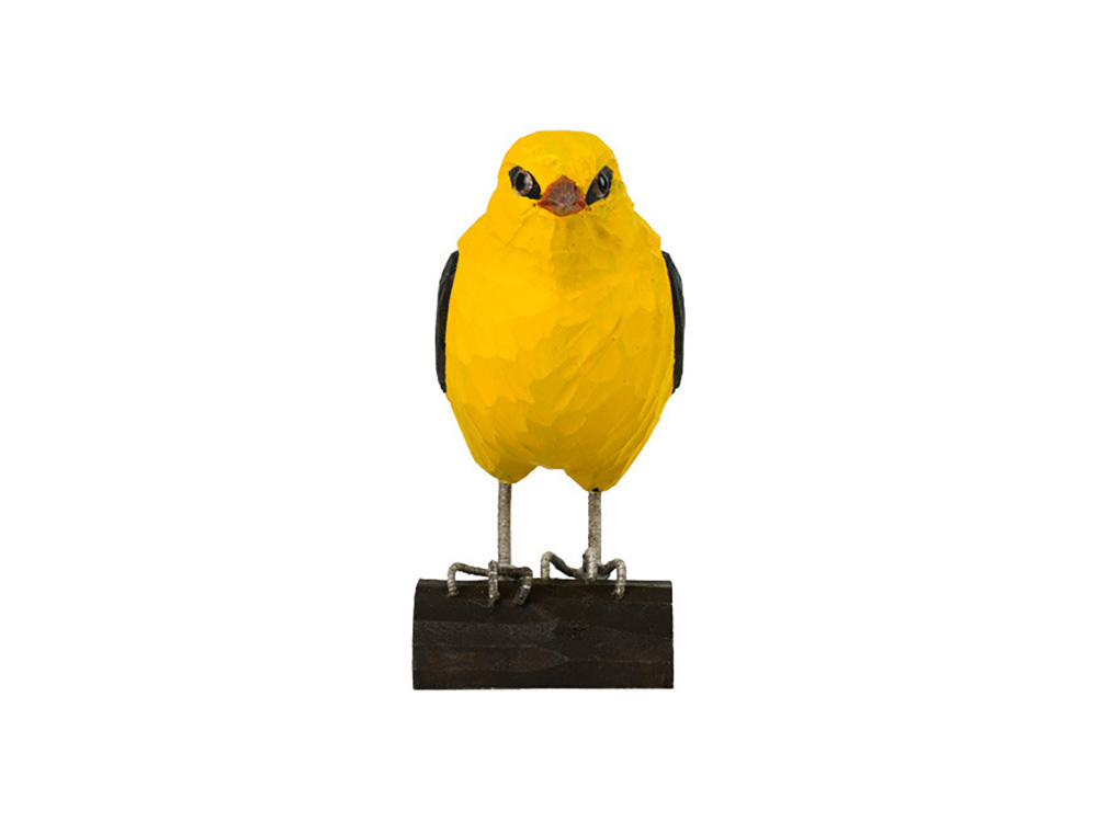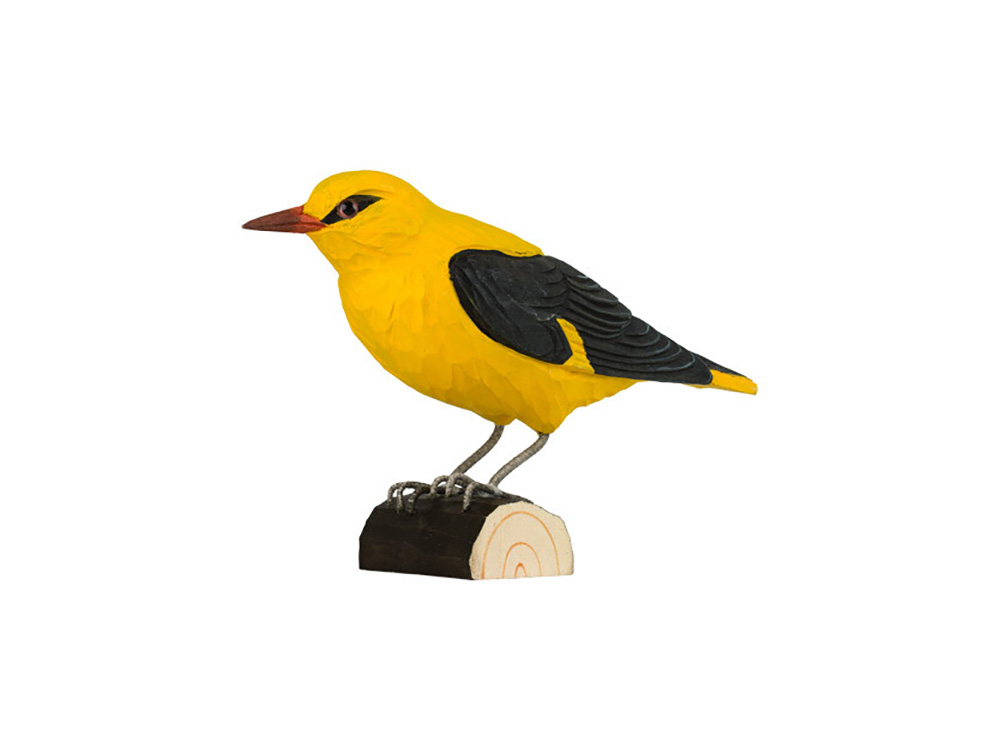 Ambachtelijk vormgegeven houten wielewaal. De wielewaal wordt op ware grootte weergegeven en is beschilderd met milieuvriendelijke verf. Hij rust op een houten tak zodat je hem eender waar in het interieur kan plaatsen.