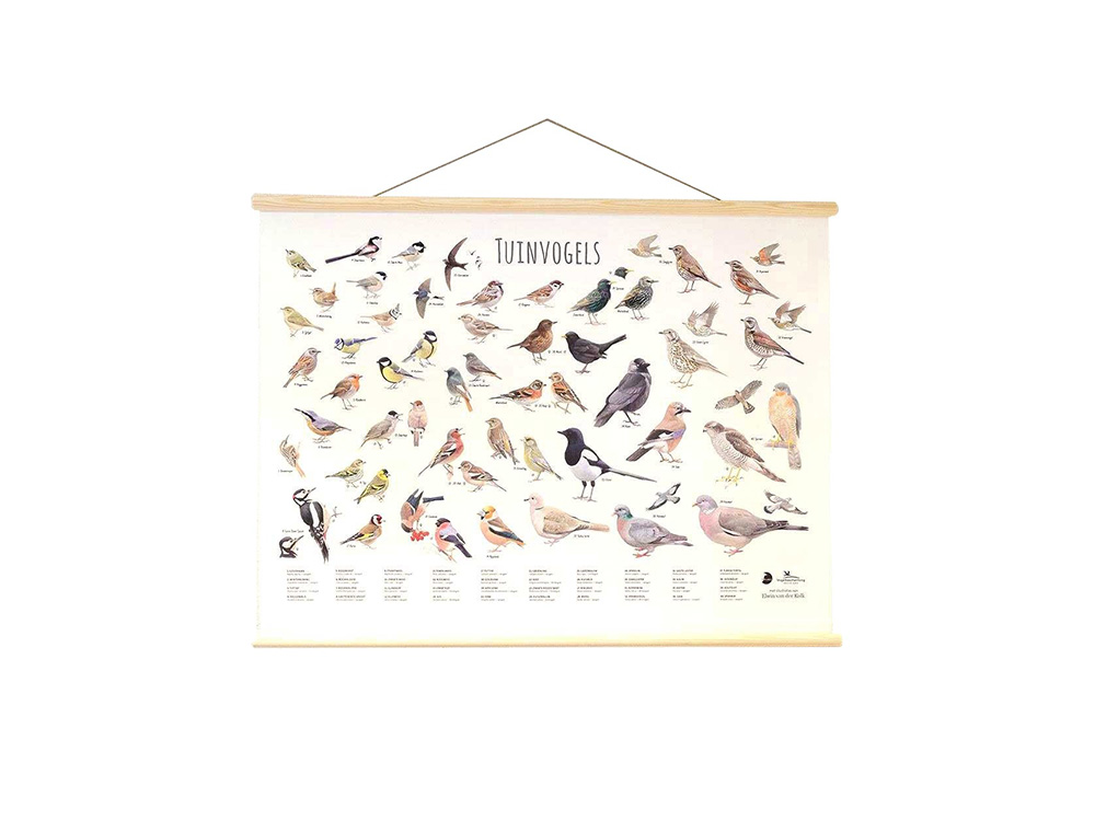 Prachtige wanddoek met 40 gedetailleerde illustraties van tuinvogels door Elwin van der Kolk.