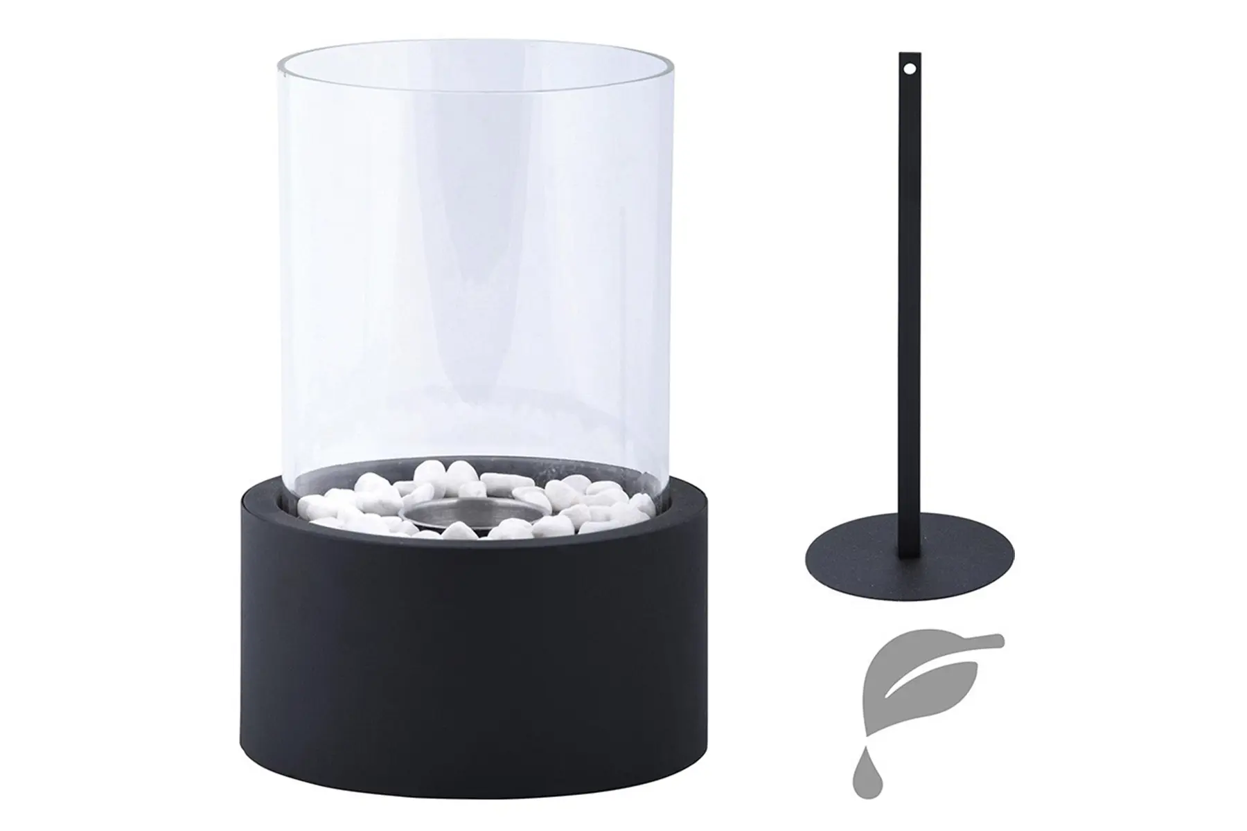 De basis van de haard is gemaakt van metaal met zwarte coating waarin de brander rust. De vlam wordt omgeven door een glazen stolp die bovenaan open is en de meegeleverde witte steentjes zorgen voor een decoratieve touch.