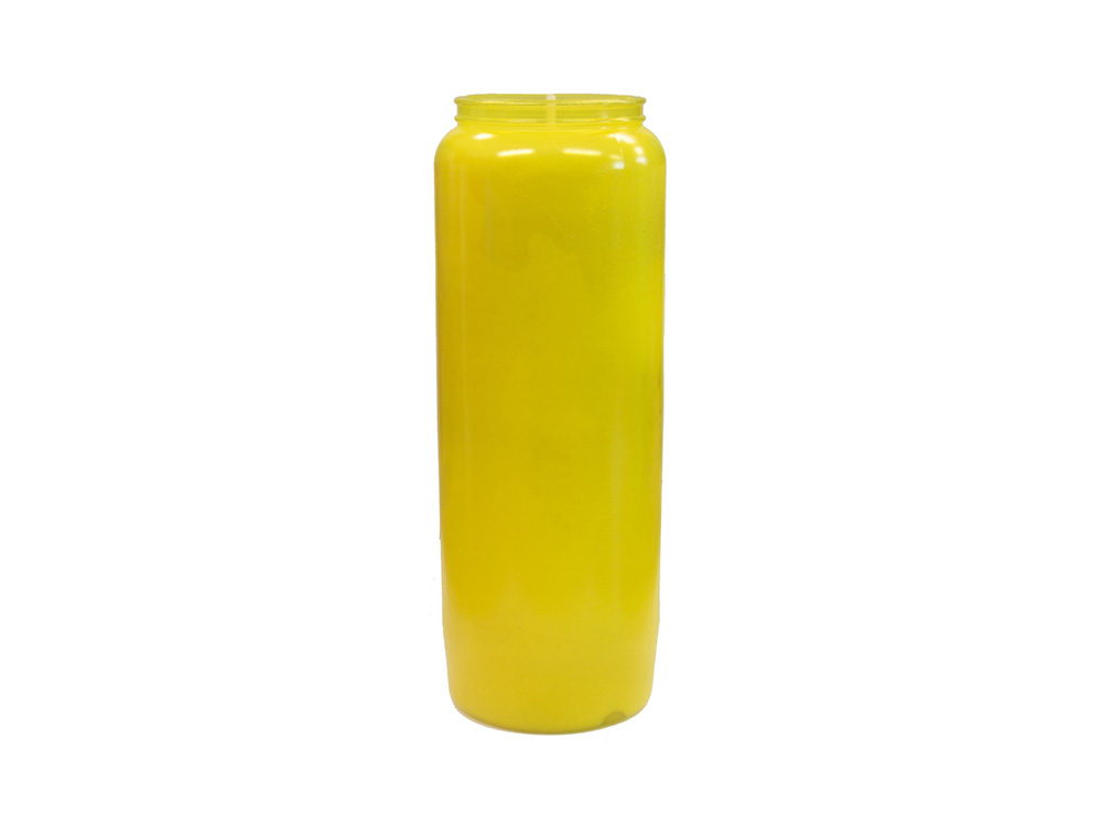 De witte kaars zit in een gele doorzichtige kunststof houder.