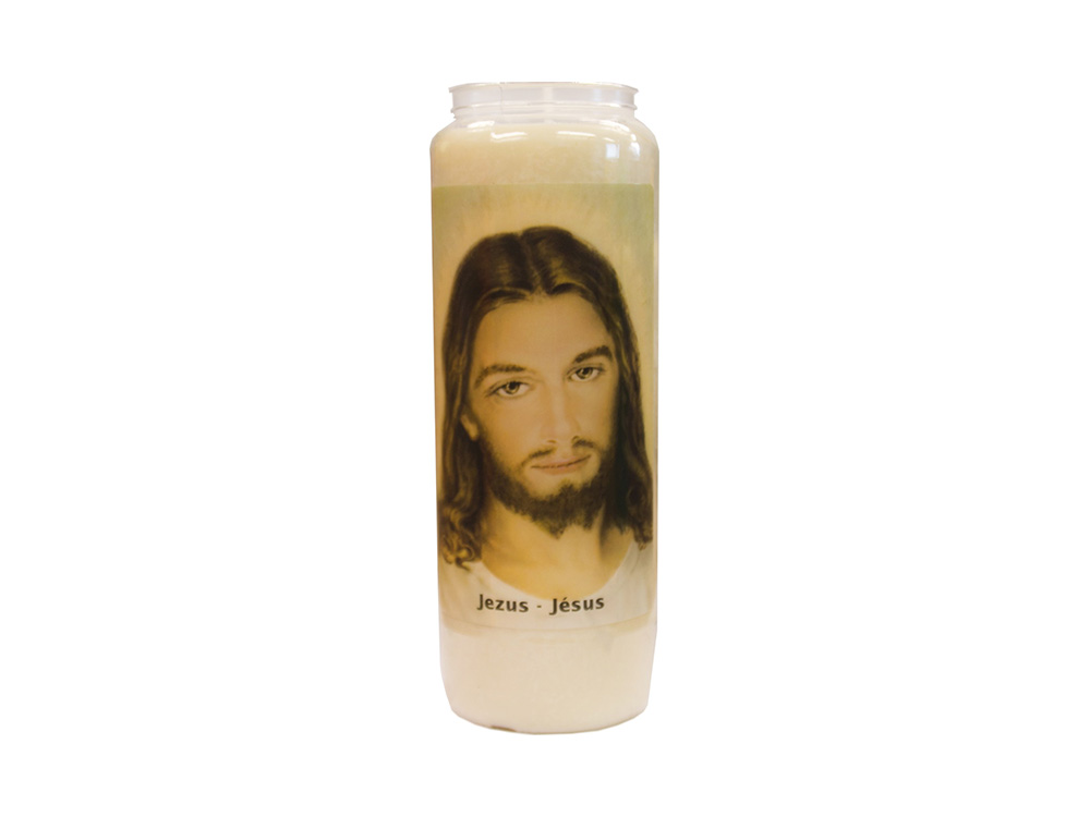 De kaars heeft een doorzichtige kunststof houder met een afbeelding van Jezus en het opschrift 'Jezus - Jésus'.