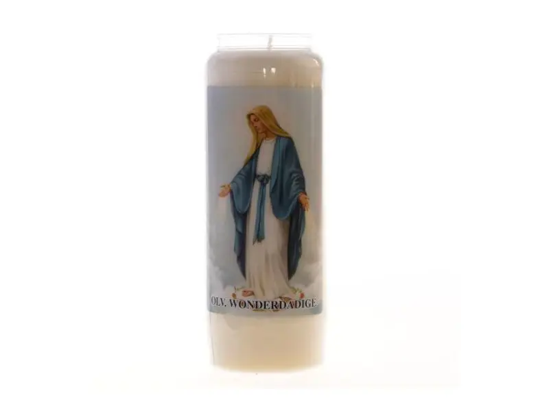 De kaars zit in een doorzichtige kunststof houder met een afbeelding van Onze-Lieve-Vrouw en het opschrift "OLV. Wonderdadige".