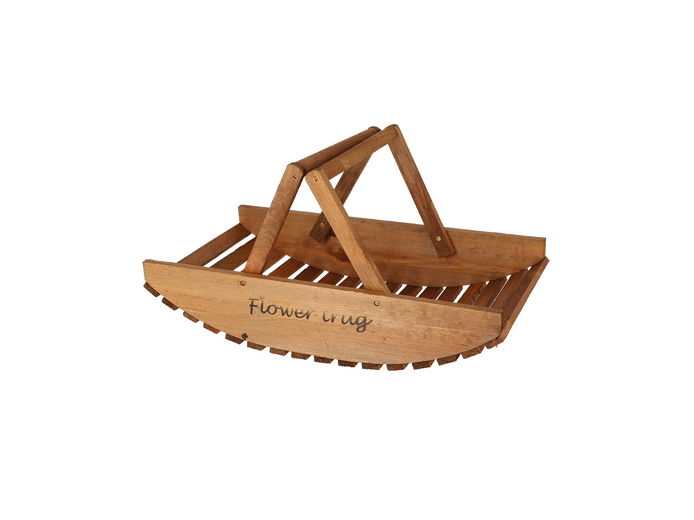 De bloemenplukmand is vervaardigd in hout en is voorzien van het opschrift 'Flower trug'. Het hout heeft een bruine tint maar zal na verloop van tijd onder invloed van zonlicht een natuurlijke grijze patine krijgen.