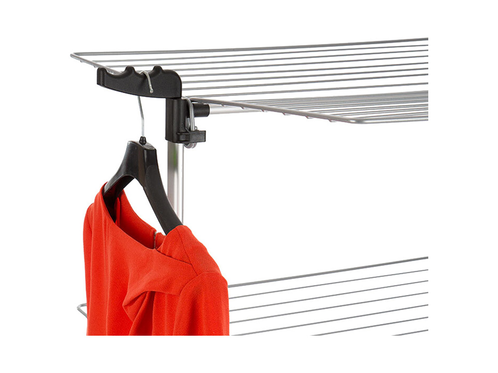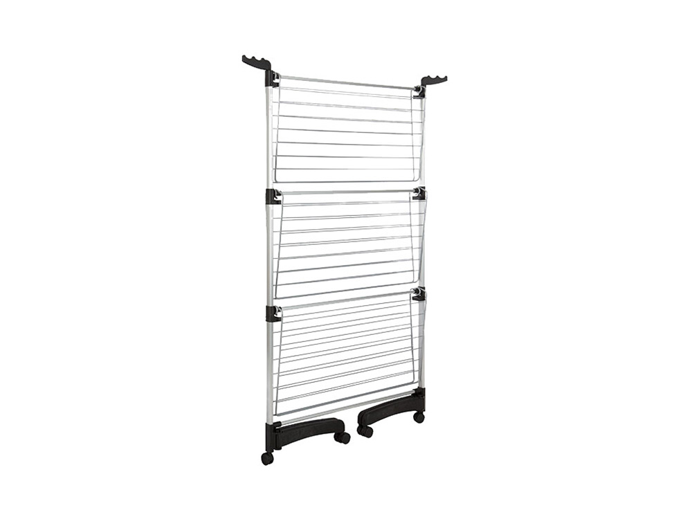 Snel en eenvoudig opklapbare droogrek. Met ca. 40 m droogdraden (14 rails per niveau) is er voldoende ruimte om jouw dagelijkse was op te hangen. Droogtoren Amélie heeft onderaan vier wieltjes en is bovenaan voorzien van twee ophanghaken om bv. kapstokken in te haken. Bij weinig plaats kan het droogrek aan één zijde worden opengeklapt. Berg het rek na gebruik gemakkelijk op door alles terug dicht te vouwen.