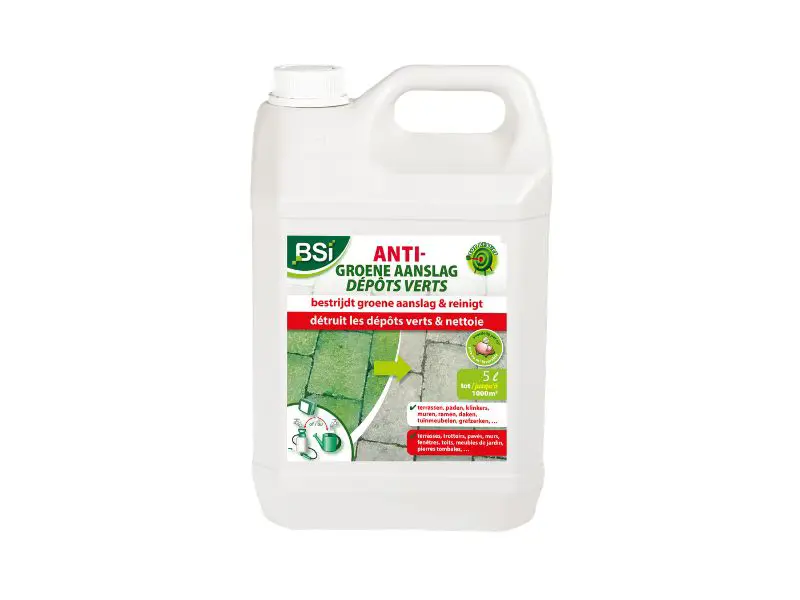 BSI Anti-Groene Aanslag verwijdert en voorkomt groene aanslag op allerlei oppervlakken, zoals paden, terrassen, opritten, tegels, tuinafsluitingen, hekwerk, muren, daken, ramen, tuinmeubelen, grafzerken, beelden, bloempotten en zwembadranden.