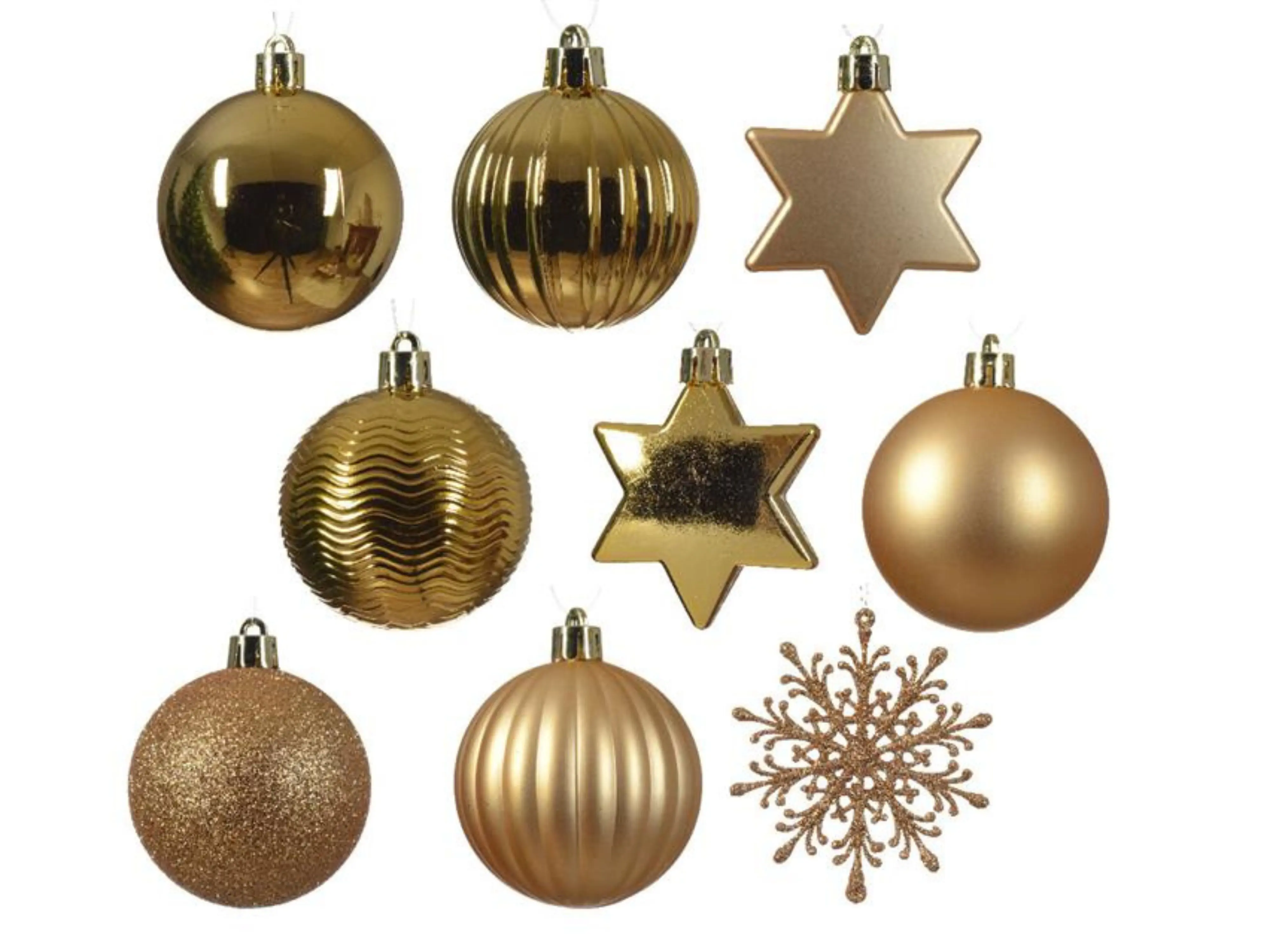 • Set van 40 gouden kerstballen en ornamenten in diverse vormen en maten.
