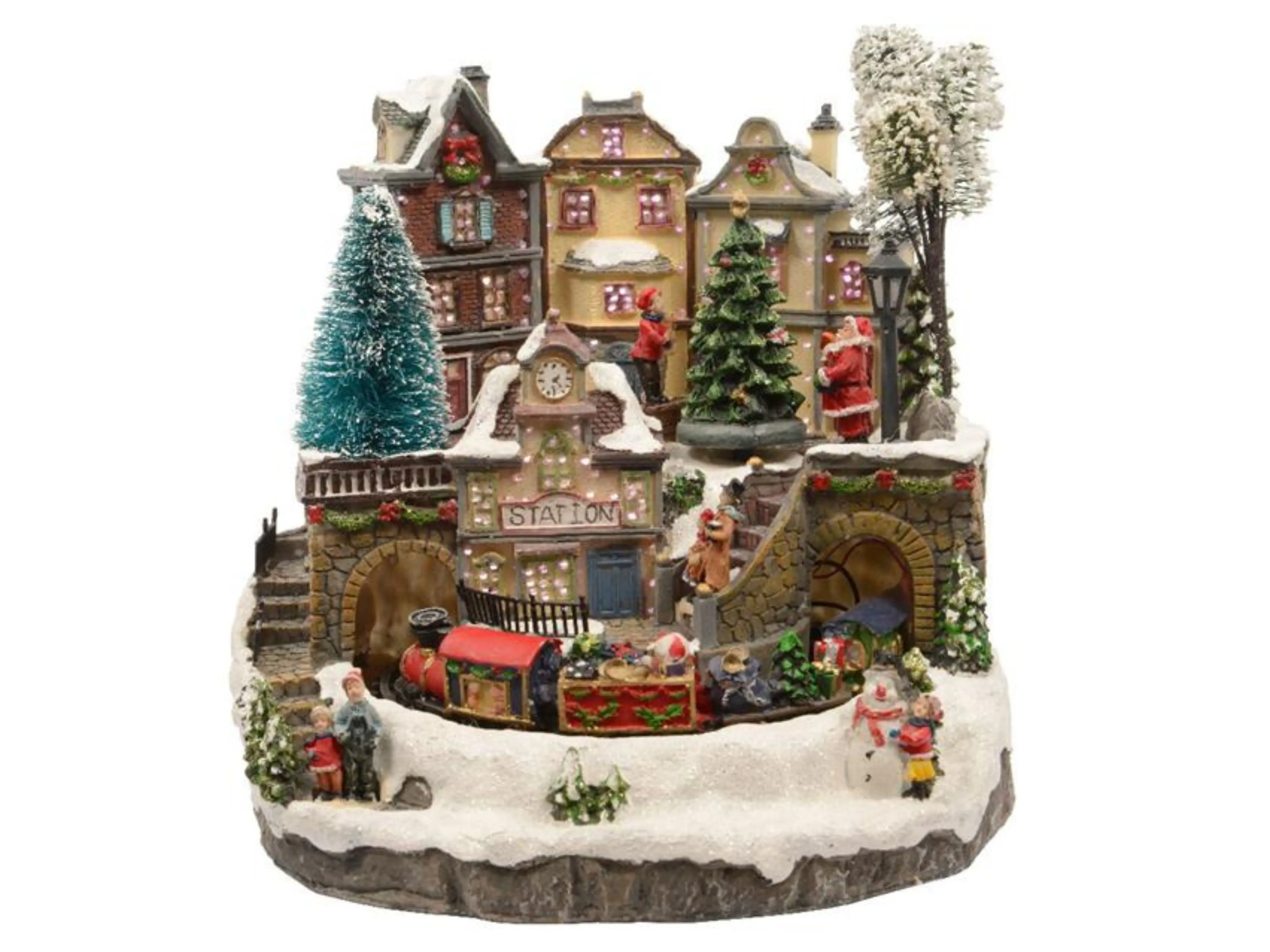 Dit handgemaakte decoratiestuk van polyresin is rijk gedetailleerd en voorzien van multi-color LED’s die sfeervol licht geven. Dankzij de bewegende trein en de vrolijke muziek komt het tafereel echt tot leven. Ideaal als eyecatcher op een dressoir, vensterbank of als centerpiece op tafel. Dit bestseller kersttafereel zorgt gegarandeerd voor een warme, feestelijke sfeer in elke ruimte.