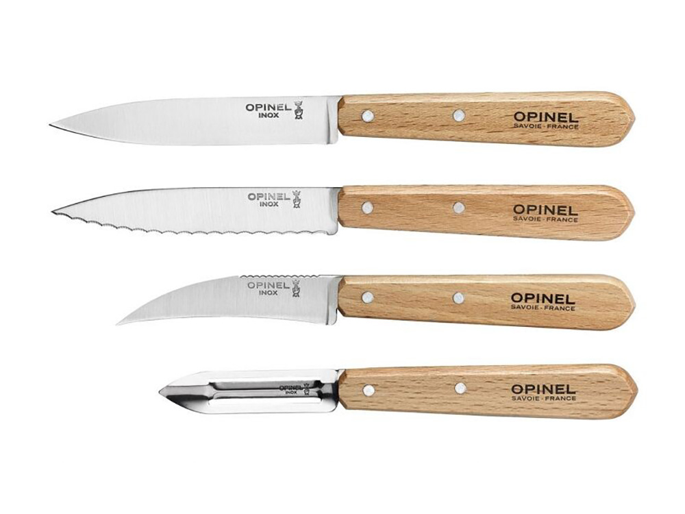 Leuke en complete set van drie kleine keukenmessen en dunschiller van het gerennomeerde merk Opinel. Het gewone keukenmesje en de dunschiller zijn onmisbaar in de keuken.