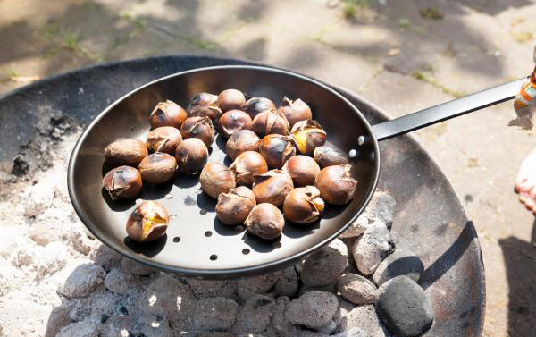 Maak een inkeping in de kastanjes en leg ze in de pan. Schud de pan af en toe boven de vlammen van een vuurkorf of haardvuur om de kastanjes gelijkmatig te poffen.