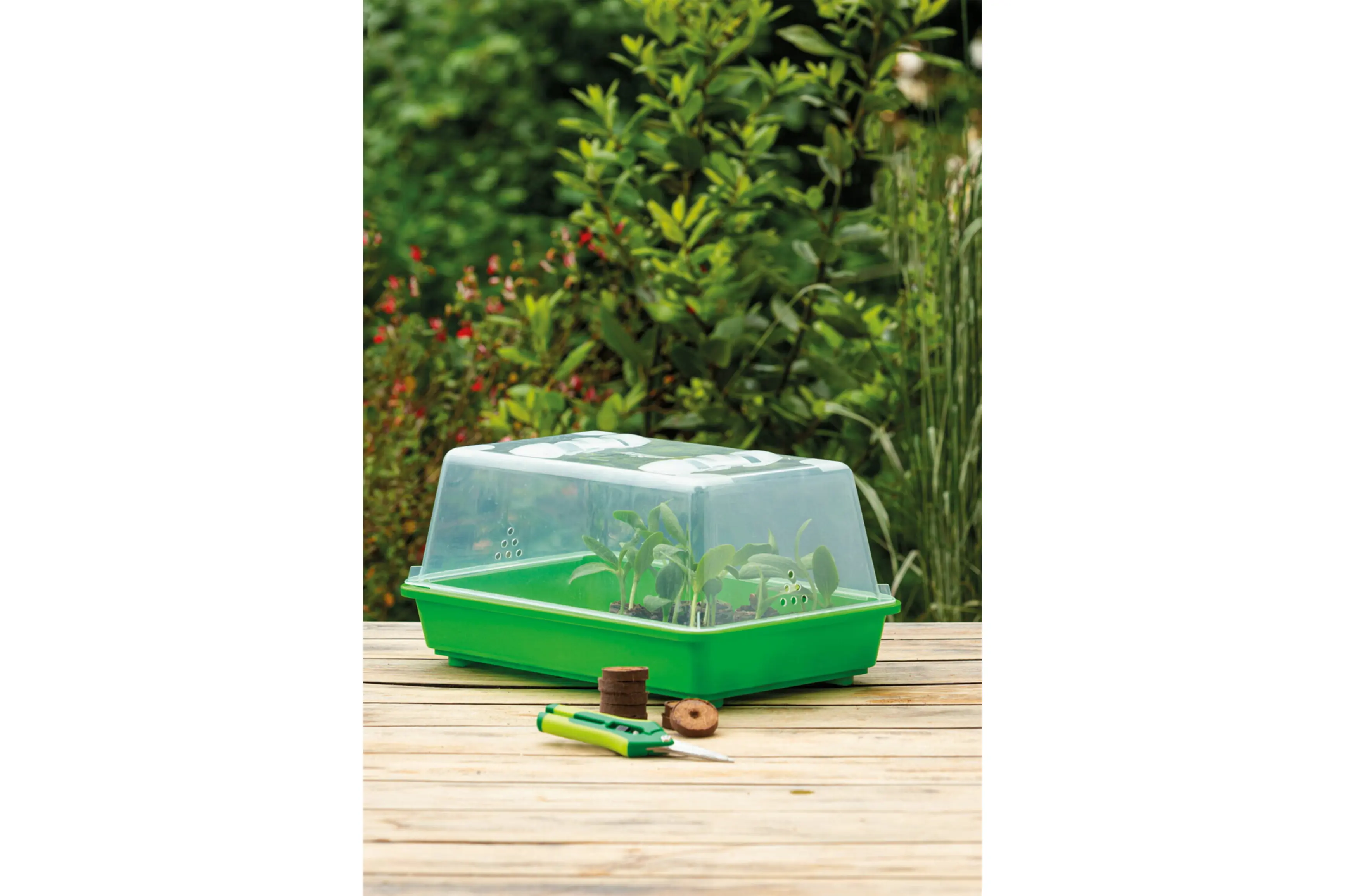 De kas past perfect op de vensterbank, schuifjes in het deksel zorgen voor een goede ventilatie en condenswater loopt langs het deksel terug naar de bodem zonder te druppelen. Extra openingen aan de zijkant van het deksel zorgen ook voor de aanvoer van verse lucht.