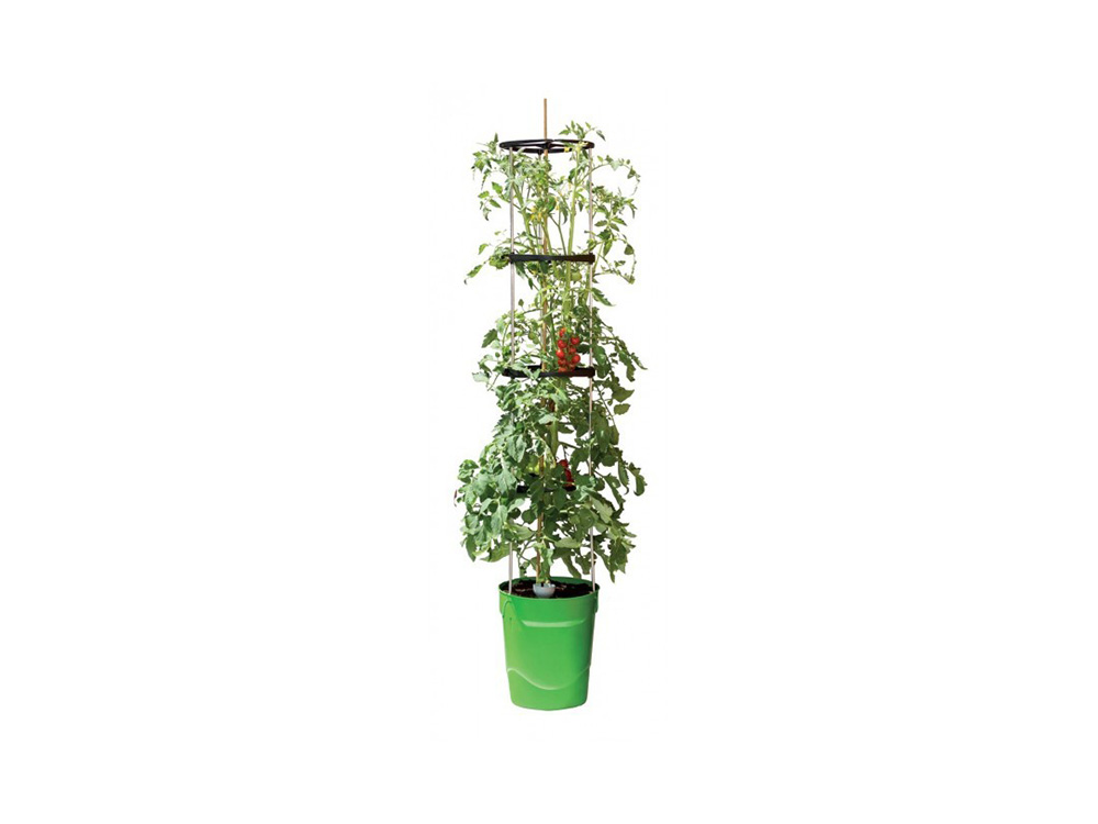 De pot is voorzien van een stevige, 150 cm hoge plantondersteuning bestaande uit vier ringen en aluminium geleiders. De toren met 4 niveaus zorgt voor een perfecte groei.