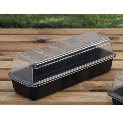 Smalle kweekkas of zaaibakje, een ideaal formaat voor op je vensterbank. Deze propagator met zwarte onderschaal is voorzien van de nodige drainagegaatjes en kan worden afgedekt met een transparant deksel.