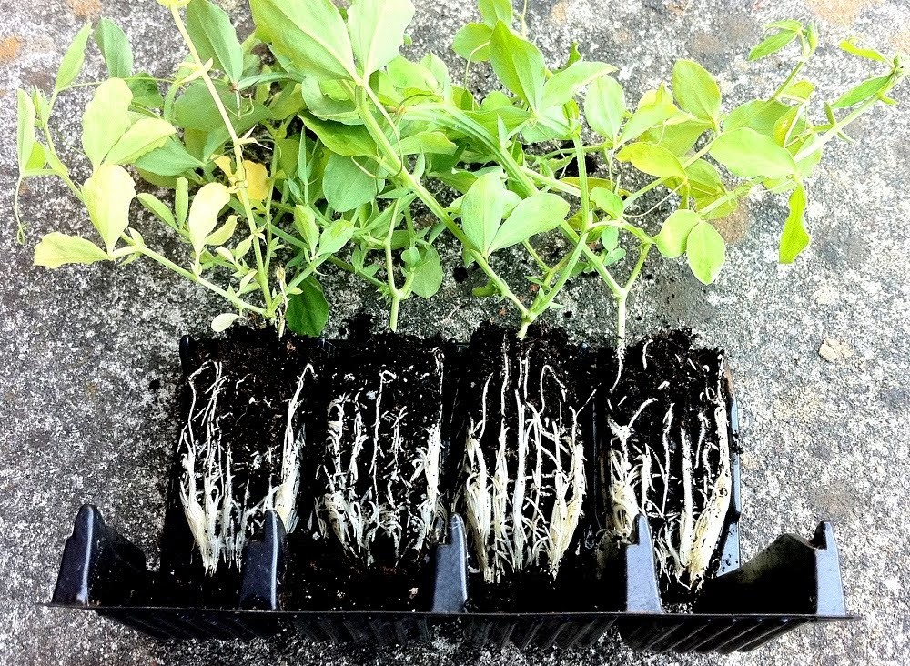 Het principe is eenvoudig. In de diepe cel komt de hoofdwortel snel aan het grote drainegegat op de bodem en sterft af. Hierdoor reageert de zaailing en maakt hij tal van zijwortels aan die op hun beurt mooi naar beneden worden geleid door de groeven in de celwanden. Dit kan je mooi zien wanneer je de celmodules openvouwt.