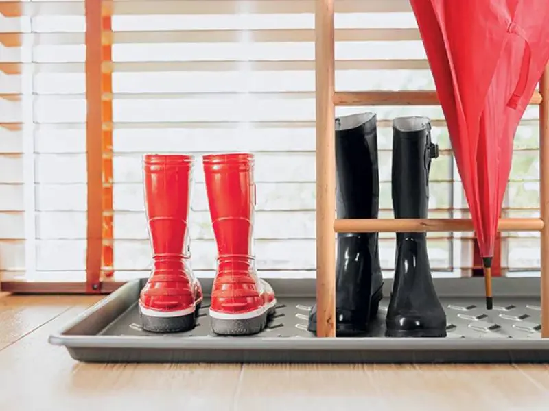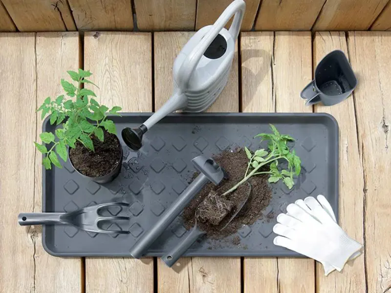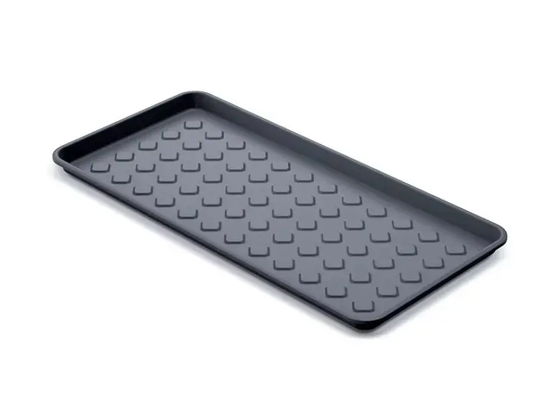 De plastic mat kan dienen als lekbak voor schoenen, of voor het verplanten van bloemen en andere huishoudelijke klusjes. Bijvoorbeeld voor de koffer in een auto, om die droog te houden.