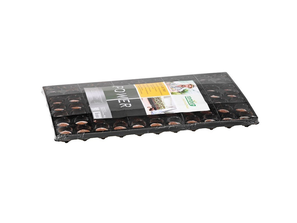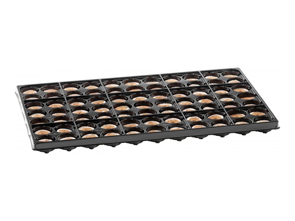 Opkweekplaat met 77 schijfjes of tabletten gemaakt van samengeperste kokosvezels. Door eenvoudig water toe te voegen zullen de schijfjes binnen de tien minuten opzwellen tot handige kweekpotjes voor het zaaien en verspenen.