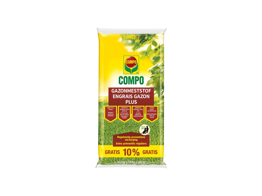 Compo gazonmeststof Plus is een organisch-minerale meststof die het gazon, gedurende 8 weken alle nodige voedingsstoffen bezorgt. Dit resulteert in een dichte, diepgroene grasmat. De meststof heeft tevens een indirecte werking tegen onkruid en mos. Daarbij draagt het hoge aandeel aan plantaardige bestanddelen bij tot de ontwikkeling van een sterk, vitaal, dens en diepgroen gazon.